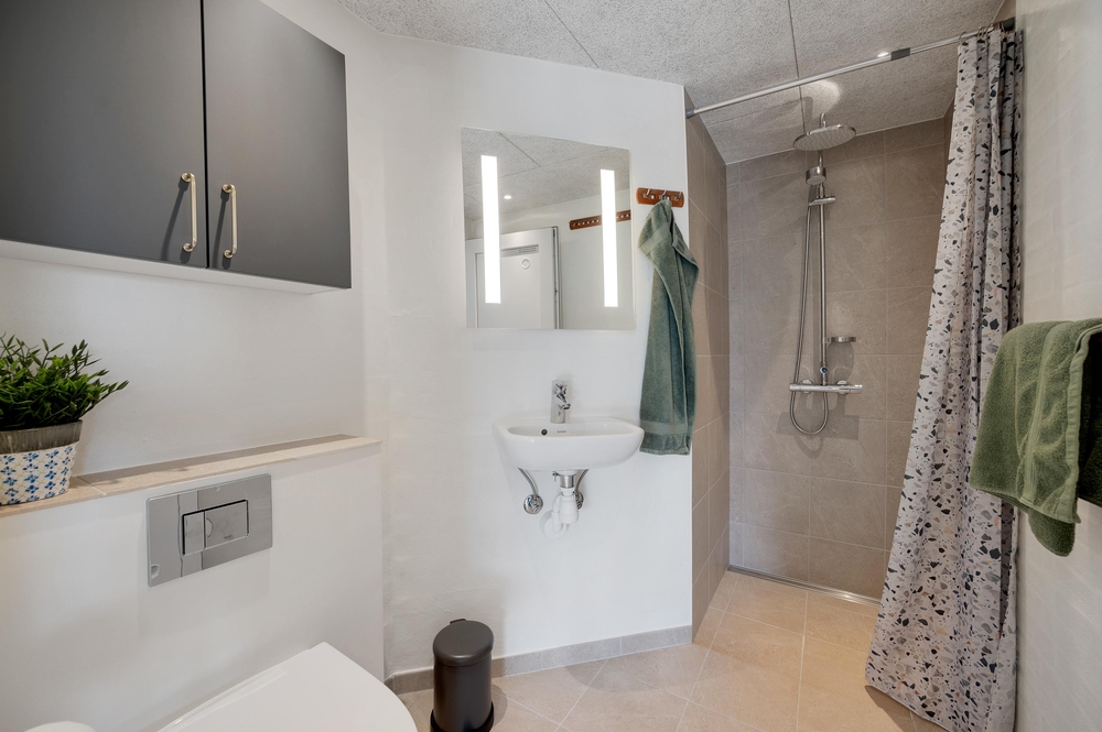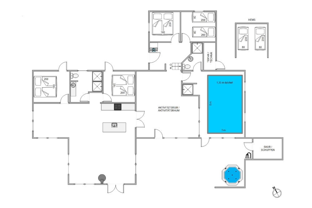 Es gibt im Ferienhaus vier Schlafzimmer, wo von zwei mit jeweils einem Doppelbett und zwei mit jeweils 2 Einzelbetten ausgestattet sind. Damit im Urlaub kein Stress aufkommt, gibt es 2 Badezimmer, was perfekt ist, wenn ihr mit 2 Familien anreist. Die Bäder sowie der Wohnraum sind mit einer Fußbodenheizung ausgestattet, welche über eine energiesparende Luft-zu-Wasser Wärmpumpe betrieben wird. Um euer Reisegepäck zu reduzieren, gibt es im Ferienhaus eine Waschmaschine und einen Trockner.