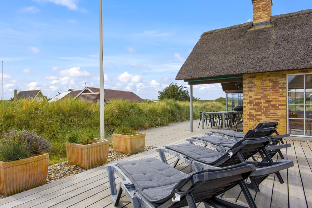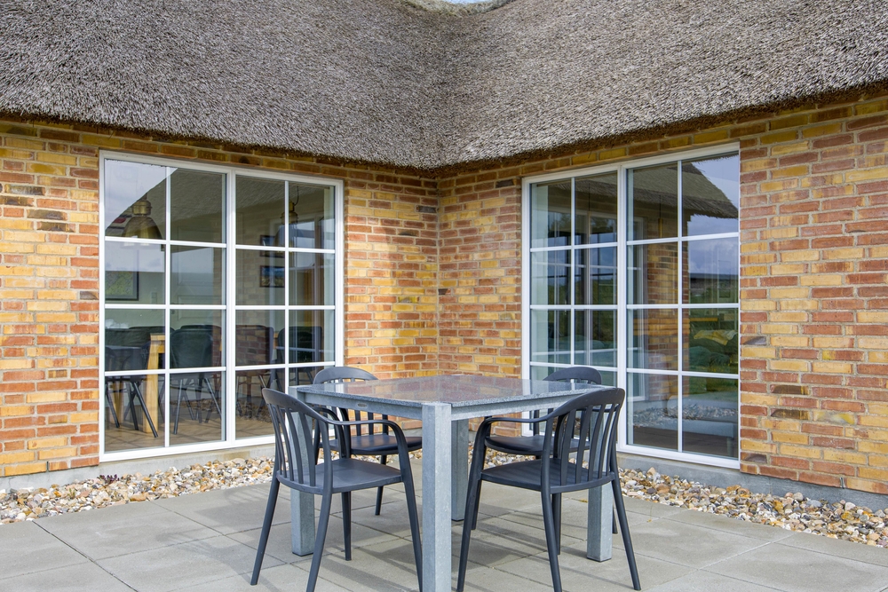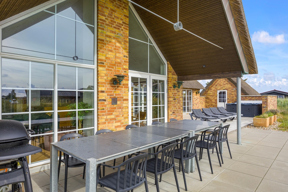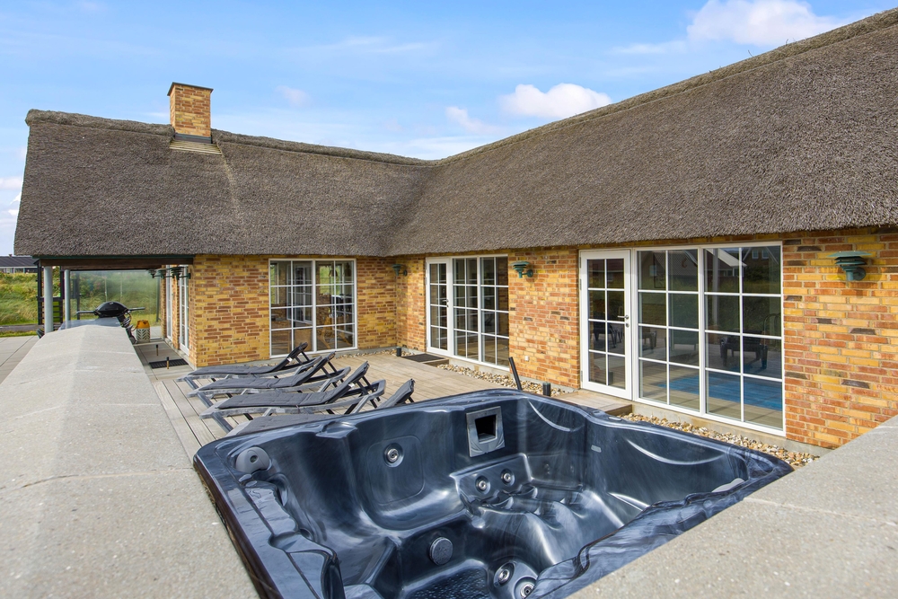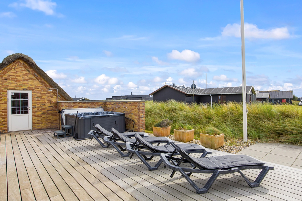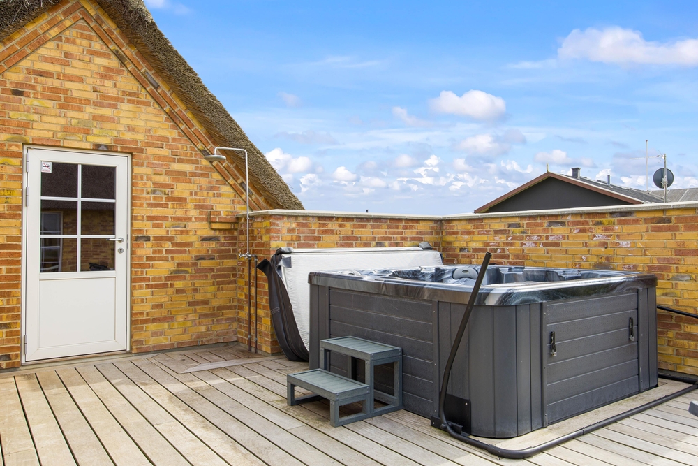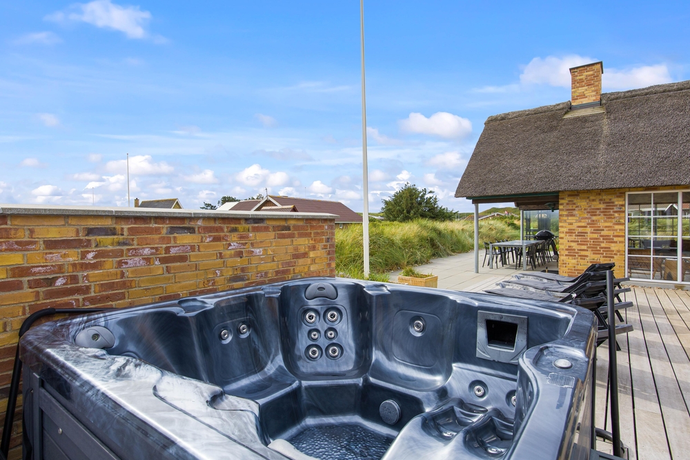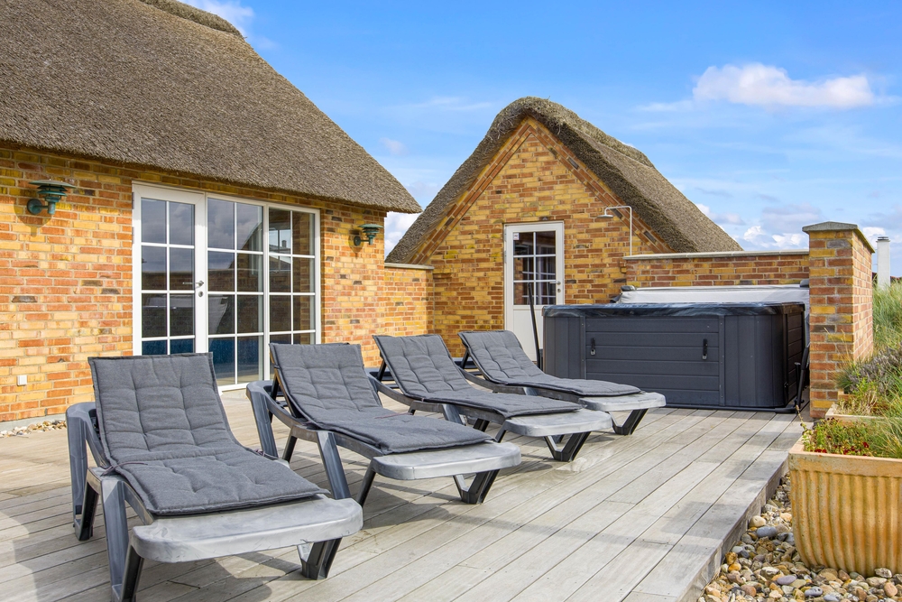 Außerhalb des Ferienhauses sind die Terrassen so angelegt, dass ihr immer eine windgeschützte Ecke findet, wo ihr es euch bei schönem Wetter mit einem guten Buch auf den bereitstehenden Terrassenmöbeln gemütlich machen könnt. Zusätzlich findet ihr auf der Terrasse einen Außenwhirlpool, der unter dem Sternenhimmel ein besonderes Erlebnis bietet.