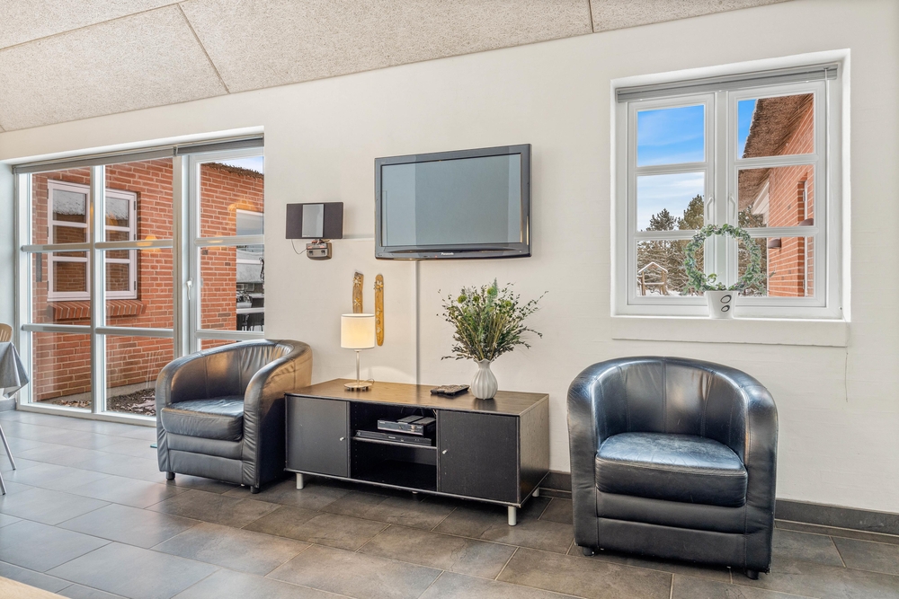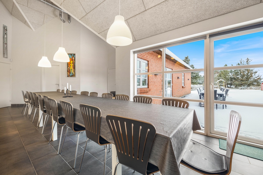 In der modernen Küche mit großzügigem Küchenblock in der Mitte, sieht man doppelt: für 22 Personen braucht es eine entsprechende Ausstattung. So findet ihr zwei Geschirrspülmaschinen, zwei Backöfen und zwei Kühlschränke. Auch eine Waschmaschine und ein Wäschetrockner wurden im Ferienhaus nicht vergessen. Trotz der großen Räume mit den luftigen hohen Decken, geht die Gemütlichkeit hier nicht verloren. Mit einem knisternden Feuer im Kaminofen könnt ihr es euch in einem der vielen Sessel oder Sofas so richtig ?hyggelig? machen.