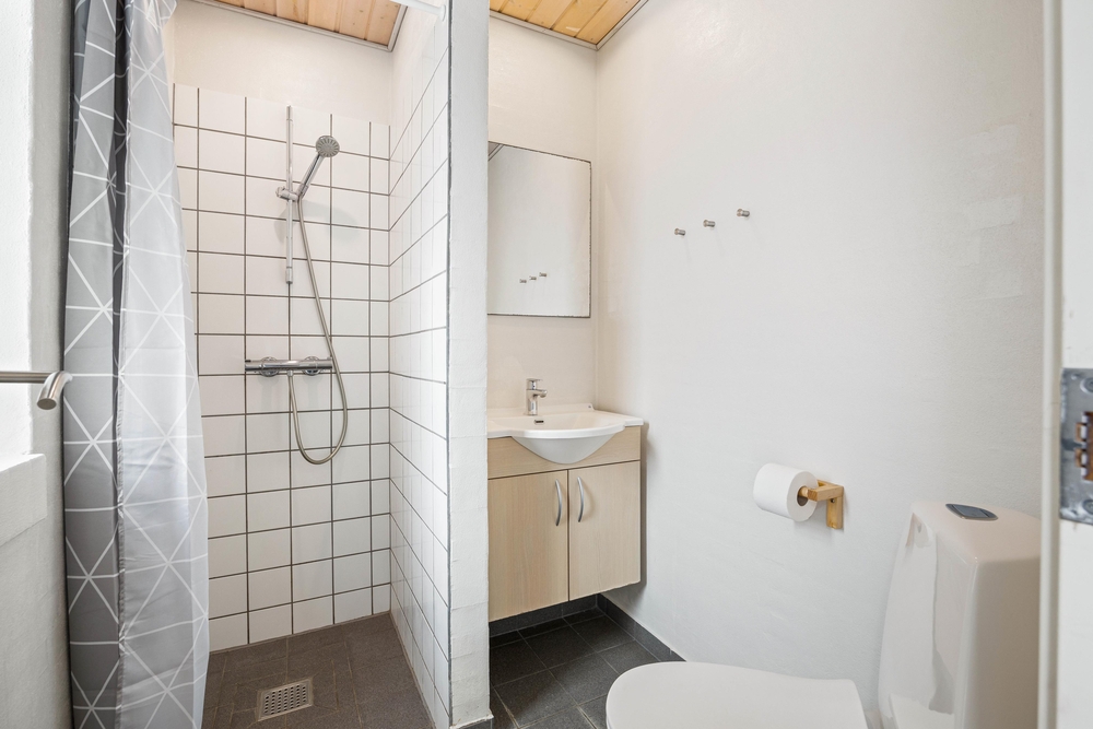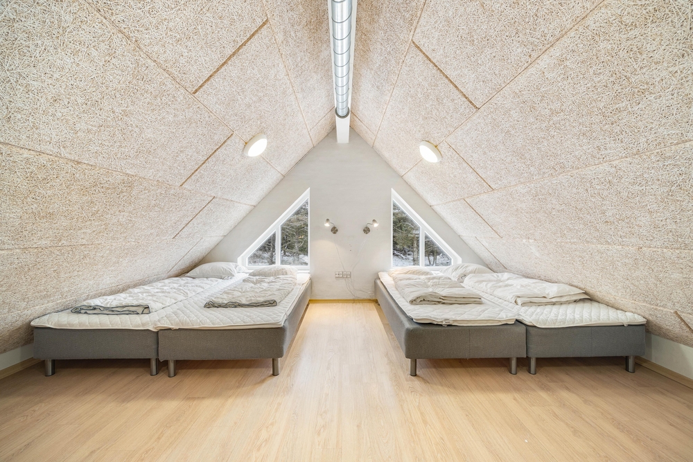 Das Haus hat 9 Schlafzimmer, 6 davon jeweils mit Doppelbetten und 3 mit jeweils zwei Einzelbetten. Ein weiterer Schlafbereich ist im ausgebauten Dachgeschoss, den man über eine Leiter vom Wohnbereich aus erreicht. Hier sind weitere 4 Schlafplätze, auf die sich die Kids bestimmt direkt stürzen werden. Denn dort oben ist es richtig gemütlich. Es gibt insgesamt 4 Badezimmer im Haus, alle mit Fussbodenheizung.