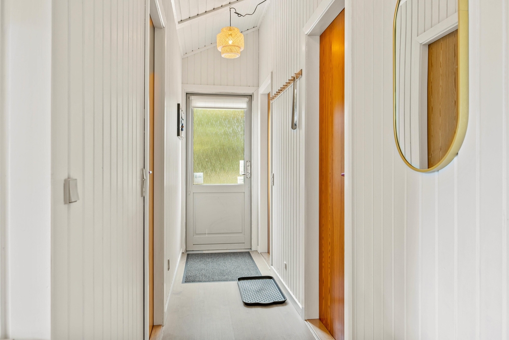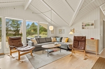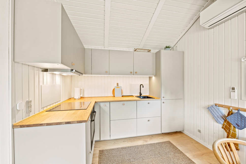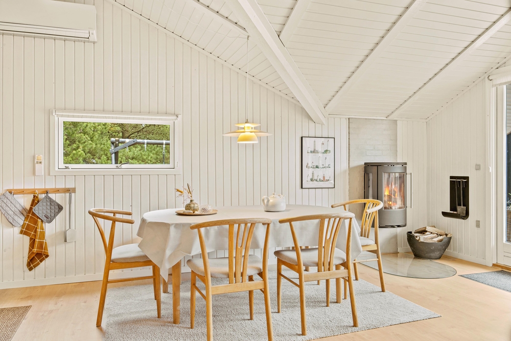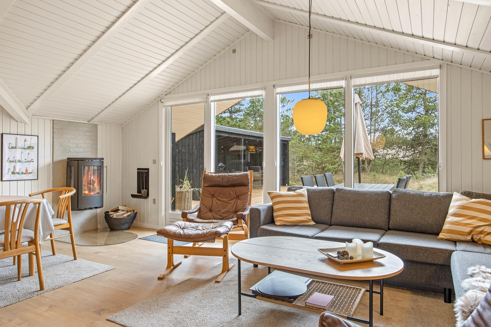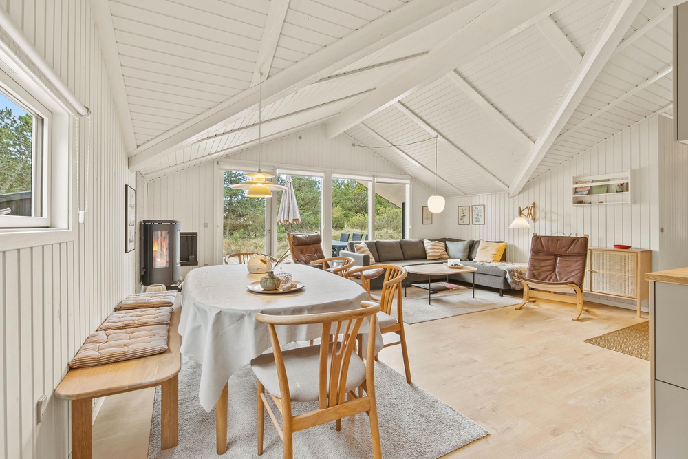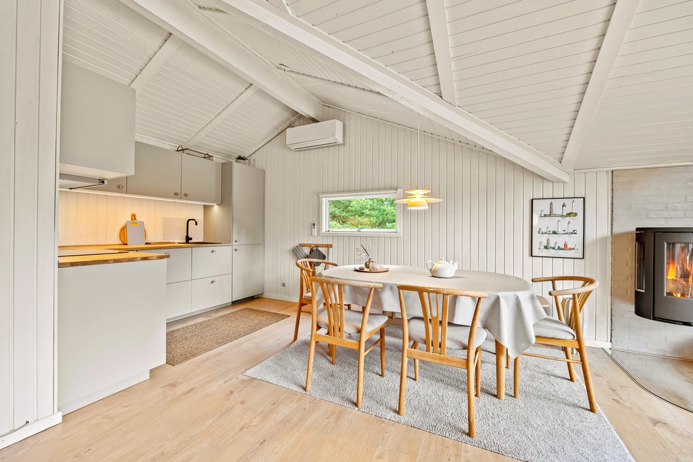 Die 69 m² des Ferienhauses im Sandvej 11 begrüßen euch mit einer hellen, gemütlichen Atmosphäre, in der man sich einfach sofort wohlfühlt. Alle Räume wurden kürzlich renoviert, und mit viel Liebe zum Detail eingerichtet. Im offenen Wohnbereich mit Küche und Essplatz, erwarten euch helle Farben, hohe Decken und eine Einrichtung mit dänischen Design Klassikern. Bei einem knisternden Feuer im Kaminofen, könnt ihr es euch auf dem Sofa bequem machen und den Ausblick ins Grüne genießen. Die neue Küche ist mit modernen Geräten ausgestattet, und bietet ausreichend Arbeitsfläche für viele fleißige Helfer bei den Essensvorbereitungen.