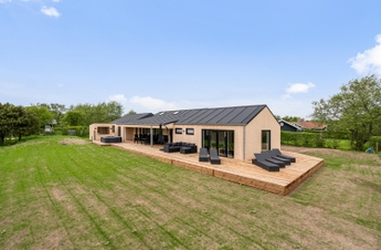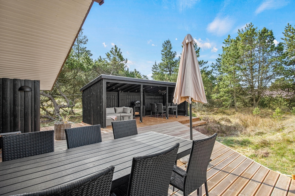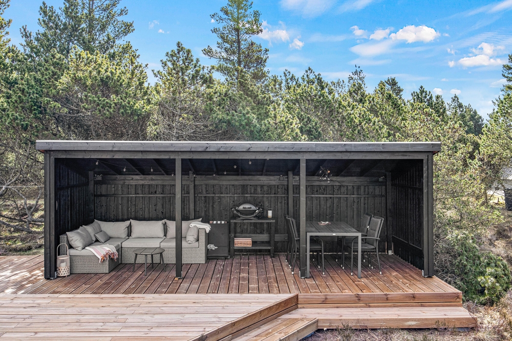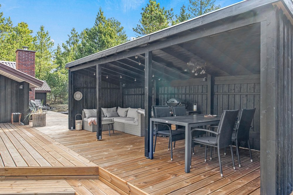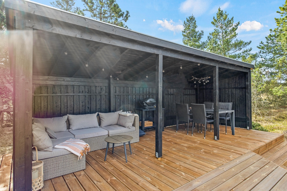 Während die Kinder spielen und Spaß haben, gönnt ihr euch eine verdiente Pause. Rund um das Ferienhaus wurde eine traumhafte Holzterrasse angelegt. Hier findet ihr immer ein ruhiges Plätzchen, um einen Moment der Ruhe zu genießen. Ein echtes Highlight ist der überdachte Teil der Terrasse. Ein richtiges Outdoor Zimmer ist hier entstanden, mit einer bequemen Sofa Lounge, gemütlicher Beleuchtung und einem Gasgrill, lassen sich hier schöne, lange Sommerabende gemeinsam verbringen.