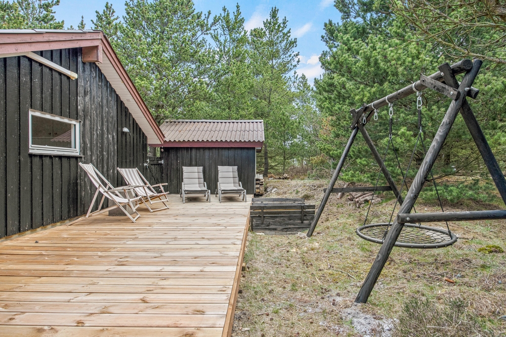 Das eingewachsene Naturgrundstück im Sandvej 11, bietet viel Platz und Natur in der sich eure Kinder und die Hunde frei bewegen können. Auf der Schaukel und in der Sandkiste darf ordentlich gespielt werden.