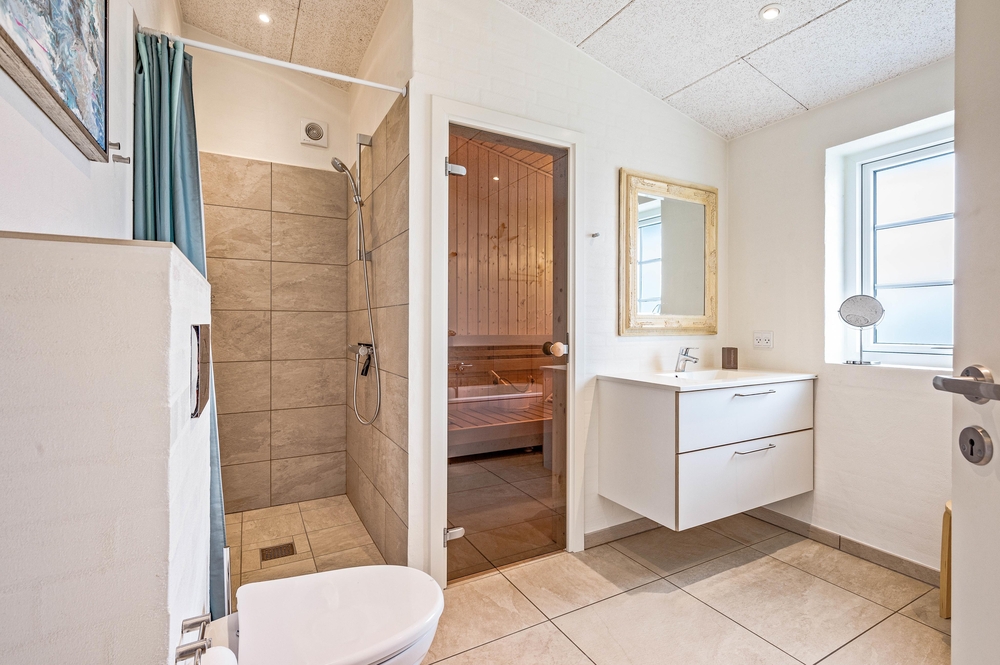 Nach einem langen und erlebnisreichen Urlaubstag könnt ihr euch in die 3 Schlafzimmer zurückziehen und dort eure Batterien wieder aufladen. Zwei Schlafzimmer sind mit jeweils einem Doppelbett ausgestattet, während das dritte Schlafzimmer über 2 Einzelbetten verfügt. Wenn ihr mit der gesamten Familie oder Freunden anreisen möchtet, dann bietet das Ferienhaus euch die beste Gelegenheit hierfür, da es mit insgesamt 2 Badezimmern ausgestattet ist, sodass es morgens zu keinem Stau vor dem Badezimmer kommt. In einem der beiden Badezimmer ist die hauseigene Sauna sowie eine große Badewanne verbaut, die für eine wohltuende Wärme und Entspannung sorgt.