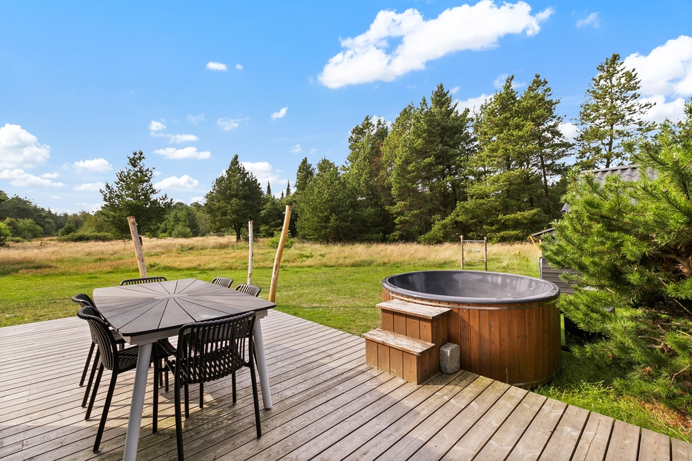 Die offene und teilweise abgeschirmte Terrasse ist mit gemütlichen Sitzmöglichkeiten ausgestattet, wo ihr morgens in Ruhe euren Kaffe trinken könnt oder einen schönen gemeinsamen Brunch, mit leckeren Dänische Spezialitäten. Zum Vergnügen der kleinen Gäste ist eine Schaukel aufgestellt. Nach einem schönen Barbecue, solltet ihr unbedingt die Badetonne aufheizen und den Abend unter dem offenen Sternenhimmel ausklingen lassen. Euer Auto und mitgebrachten Fahrräder könnt ihr im Carport unterstellen.