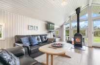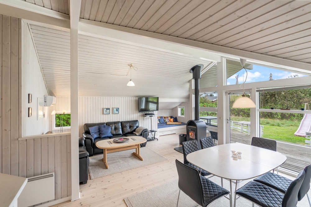 Das Herzstück dieses typisch skandinavischen Ferienhauses bildet der großzügige Wohnbereich mit offener Küche. Hier könnt ihr es euch auf dem Sofa oder in der gemütlichen Bettnische bequem machen und durch die große Fensterfront den Blick in die Natur schweifen lassen.