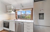 Die einfache Küche, welche aber dennoch mit einem Geschirrspüler aufwartet, liegt unmittelbar neben dem gemütlichen Essplatz, welcher im Wohnzimmer intergriert ist.