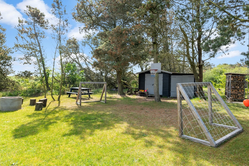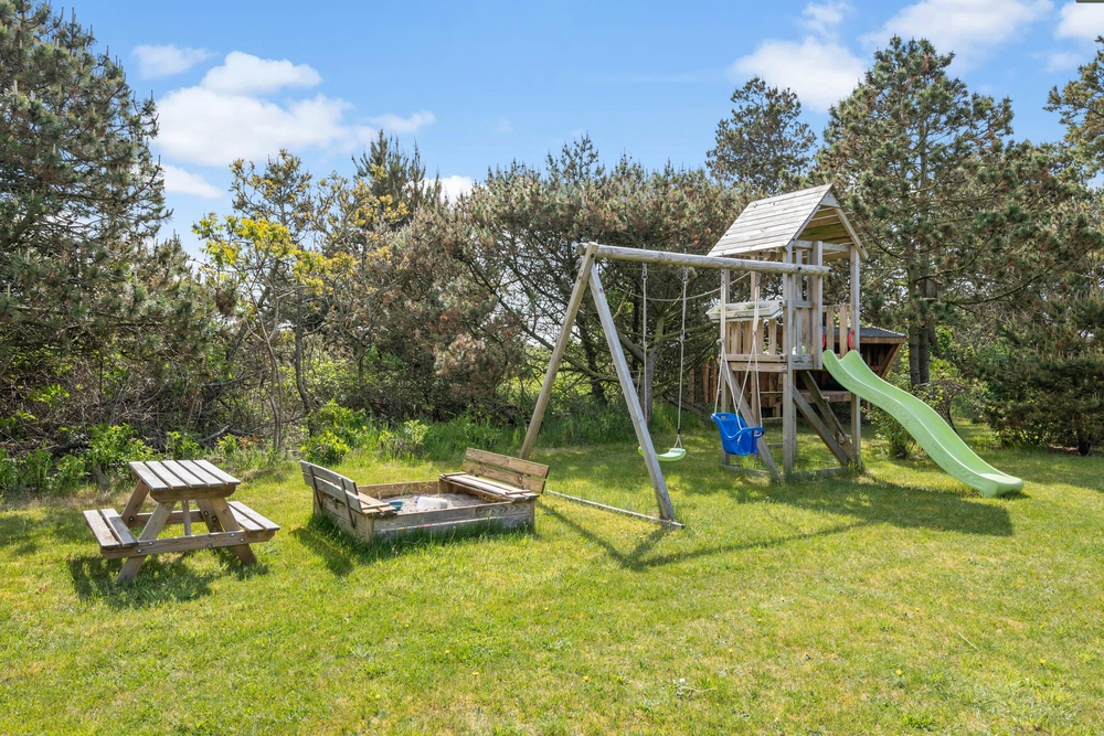 Draußen werdet ihr ein tolles Grundstück vorfinden, das gepflegt ist und vielerlei Aktivitäten zu bieten hat. Mit dem Hund können die Kinder auf den grünen Rasen spielen oder sie vergnügen sich an den Spielgeräten wie der Schaukel oder dem Sandkasten. Du kannst sie ganz einfach bei einer Tasse Kaffee auf einer der Terrassen beobachten, während du ein Buch liest oder einfach die frische Nordseeluft genießt. Ein besonderes Erlebnis bietet der Unterstand auf dem Grundstück des Ferienhauses, in dem man auch eine Nacht im Freien schlafen kann.