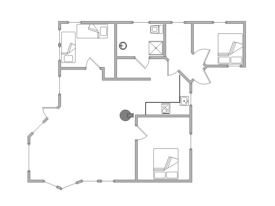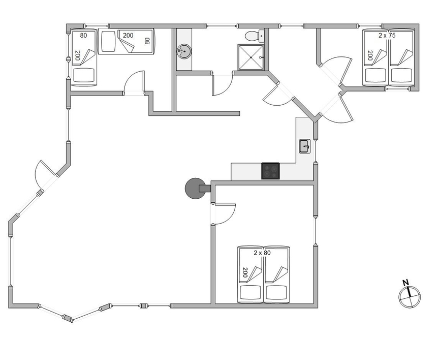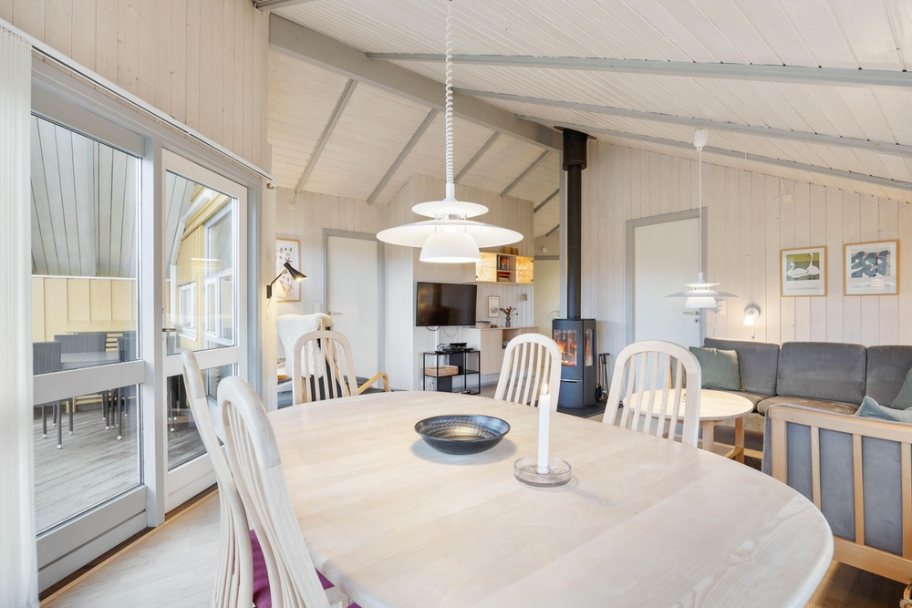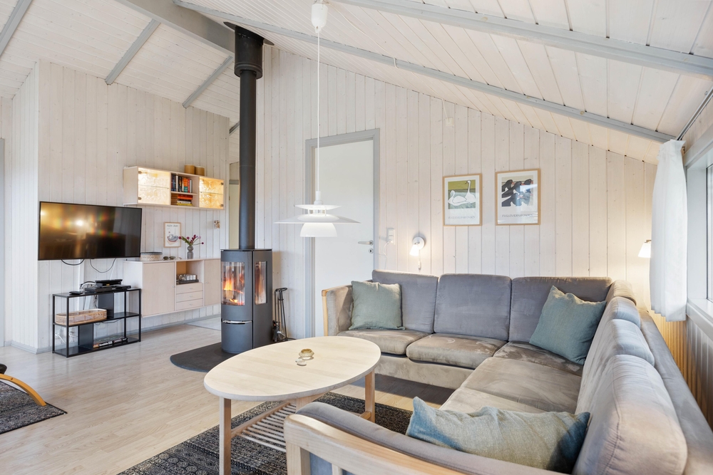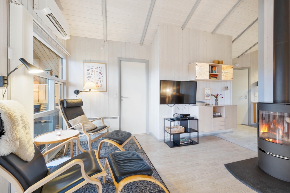 Durch die offene und gut ausgestattete Küche gelangt ihr zum Mittelpunkt des Sommerhauses ? dem mit viel Liebe zum Detail eingerichteten Wohnraum. Hier erwarten euch hohe, helle Decken, gemütliche Sitzmöbel und ein knisterndes Kaminfeuer, welches zur hyggeligen Atmosphäre beiträgt. Verbringt einen geselligen Spiele- oder DVD-Abend und genießt die Wärme. Zusätzlich könnt ihr aber auch mit der energiesparenden Wärmepumpe heizen.