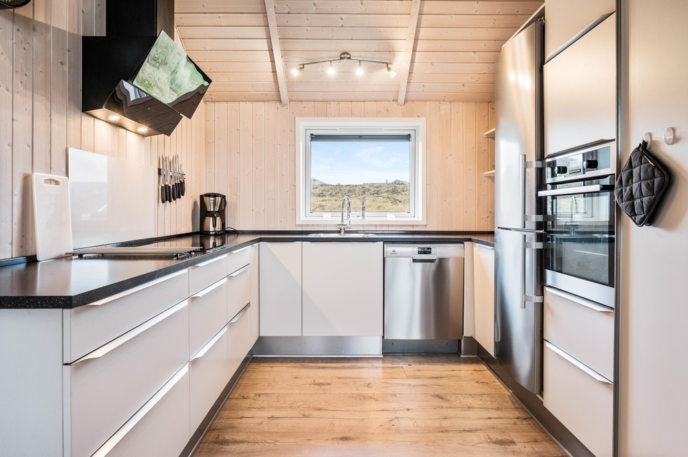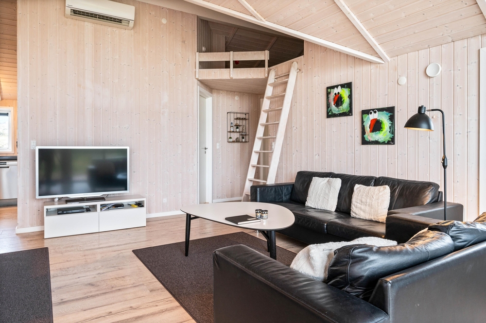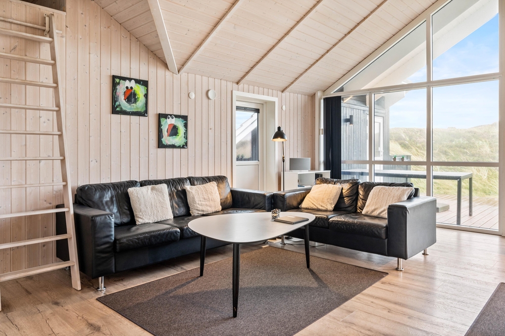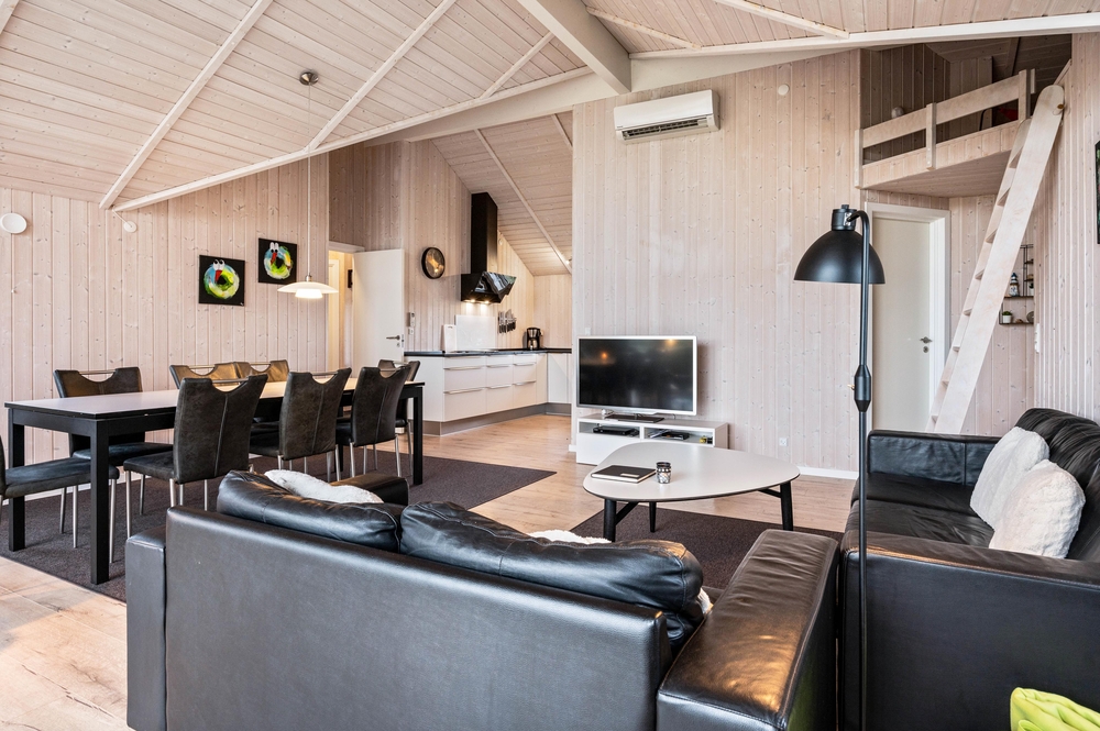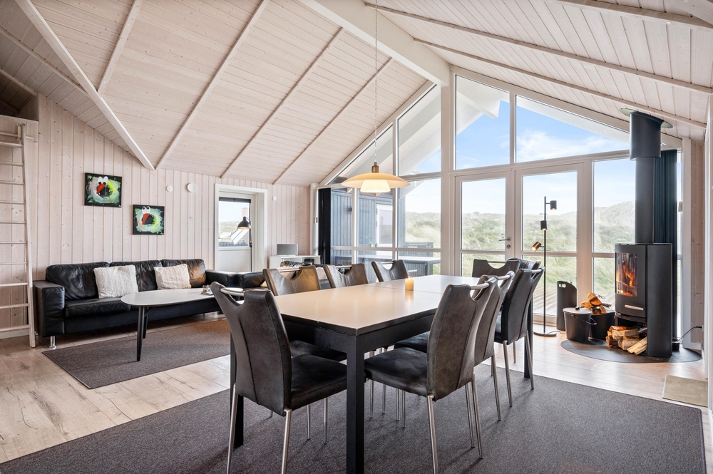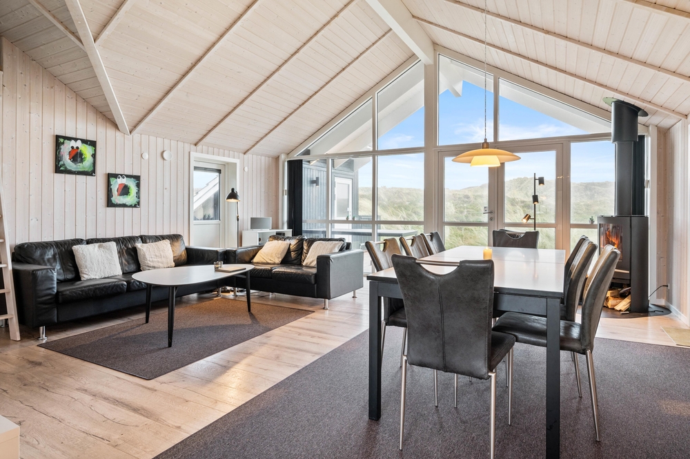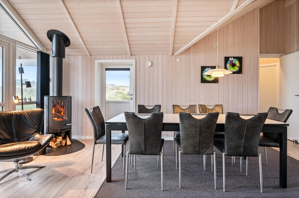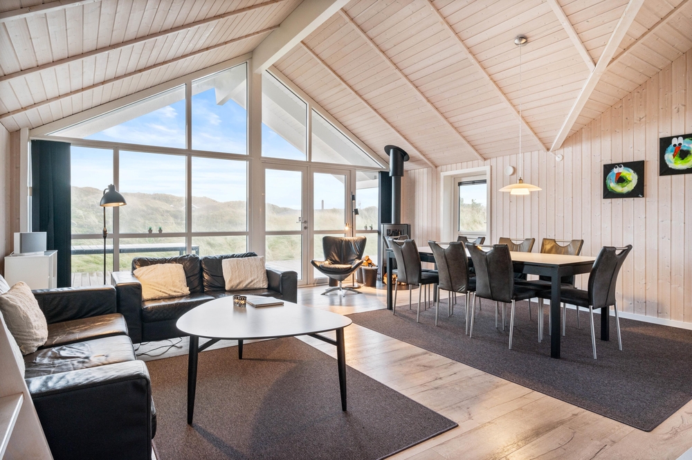 Der große Wohnbereich überzeugt mit dem Panoramafenster und der klaren und klassischen Einrichtung. Auf dem bequemen Sofa könnt ihr gemeinsam Fernsehen oder DVDs schauen, während im Kamin ein Feuer knistert. Ein Ort zum Wohlfühlen, auch bei schlechtem Wetter. Zusätzlich kann dieses gepflegte Ferienhaus auch mit der energiesparenden Wärmepumpe geheizt werden.