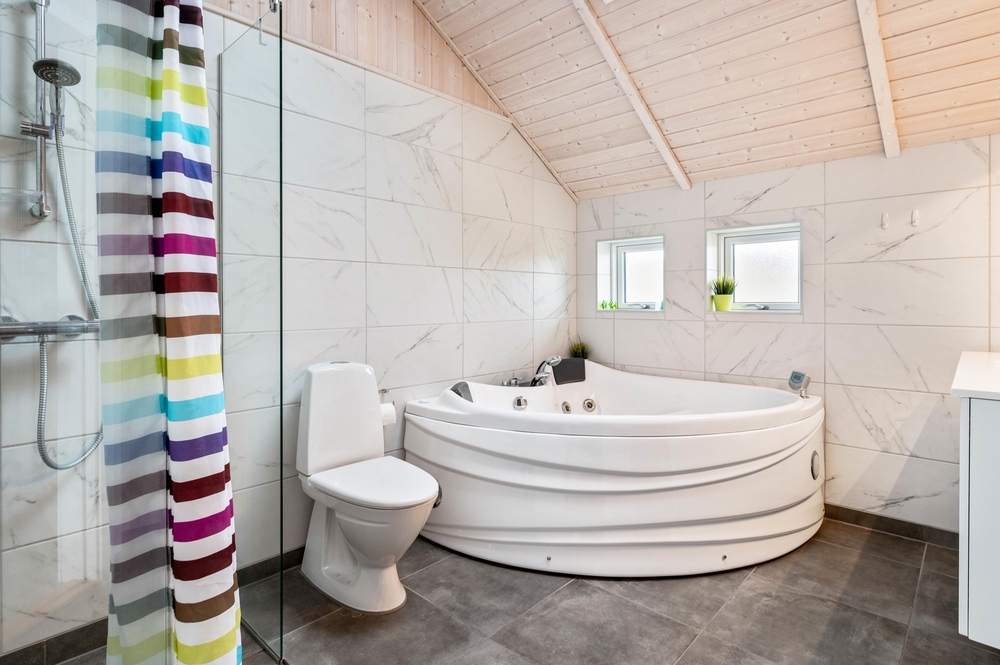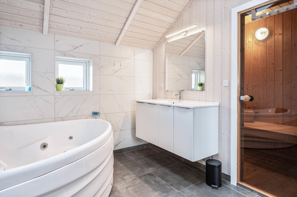 Auf der anderen Seite liegen die beiden anderen gemütlichen Schlafräume und das große Badezimmer, welches zusätzlich noch über Whirlpool und Sauna verfügt. Genießt lange Saunagänge oder entspannt euch bei einem ausgiebigen Bad im Whirlpool. In diesem Ferienhaus habt ihr beides direkt vor Ort. Besonders praktisch für Familien, ist das vor Ort bereits ein Hochstuhl, sowie ein Kinderbett vorhanden ist. Nützlich sind zudem die Waschmaschine und der Trockner. Somit könnt ihr für täglich frische Wäsche sorgen.