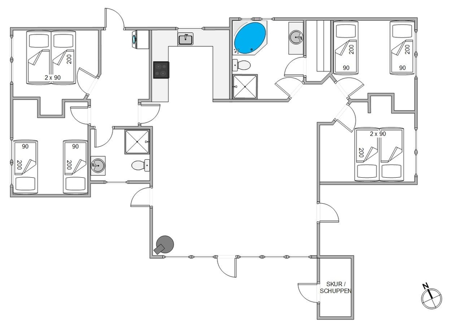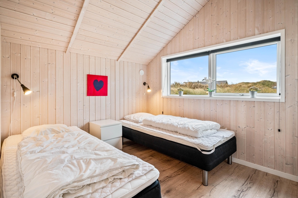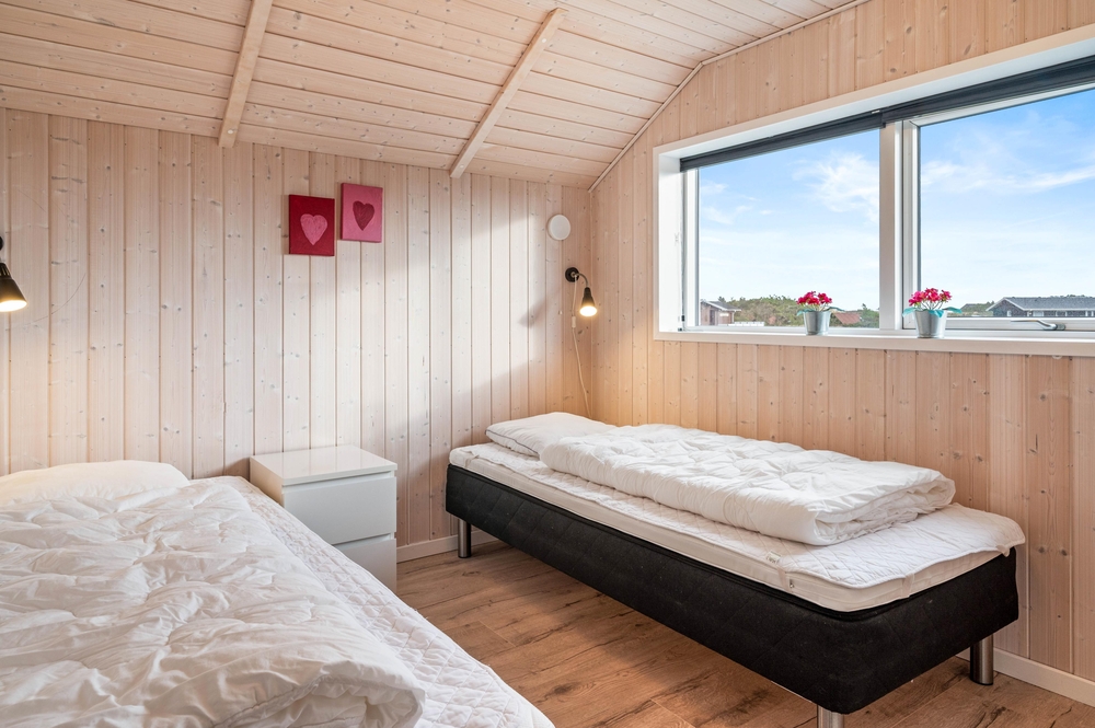 Dieses typisch dänische Ferienhaus ist perfekt für zwei Familien oder gemeinsam reisende Freunde geeignet. Durch die praktische Aufteilung der Schlaf- und Badezimmer, hat jeder seinen eigenen Bereich. Auf der einen Seite findet ihr ein Doppelbettzimmer, ein Zimmer mit 2 Einzelbetten, sowie das praktische Bad mit Dusche und Fußbodenheizung.