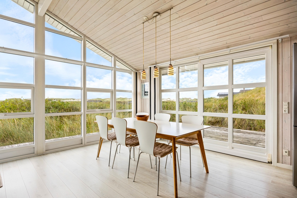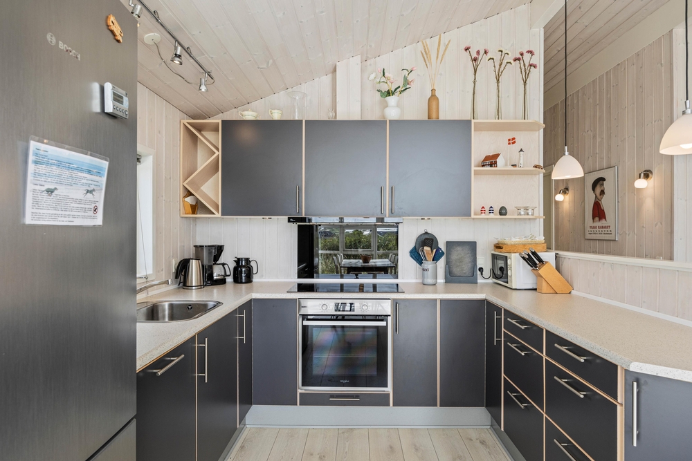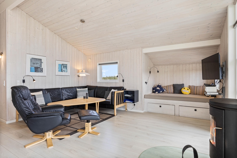 Sobald du die Tür in Skodbjergevej 38 öffnest, stellt sich sofort Urlaubsstimmung ein. Die hellen, freundlich eingerichteten Wohnräume mit holzverkleideten Wänden und offenen Decken schaffen eine luftige und freie Atmosphäre. Durch die großen Fenster- und Türpartien fällt viel Licht herein, sodass du dich der Natur ganz nah fühlst und die Aussicht genießen kannst. Mit dem Kaminfeuer kannst du es dir im Wohnzimmer gemütlich machen, ein Spiel spielen oder dich mit einem guten Buch zurückziehen. In der Alkove können die Kinder spielen oder du kannst tagsüber ein Nickerchen machen.
