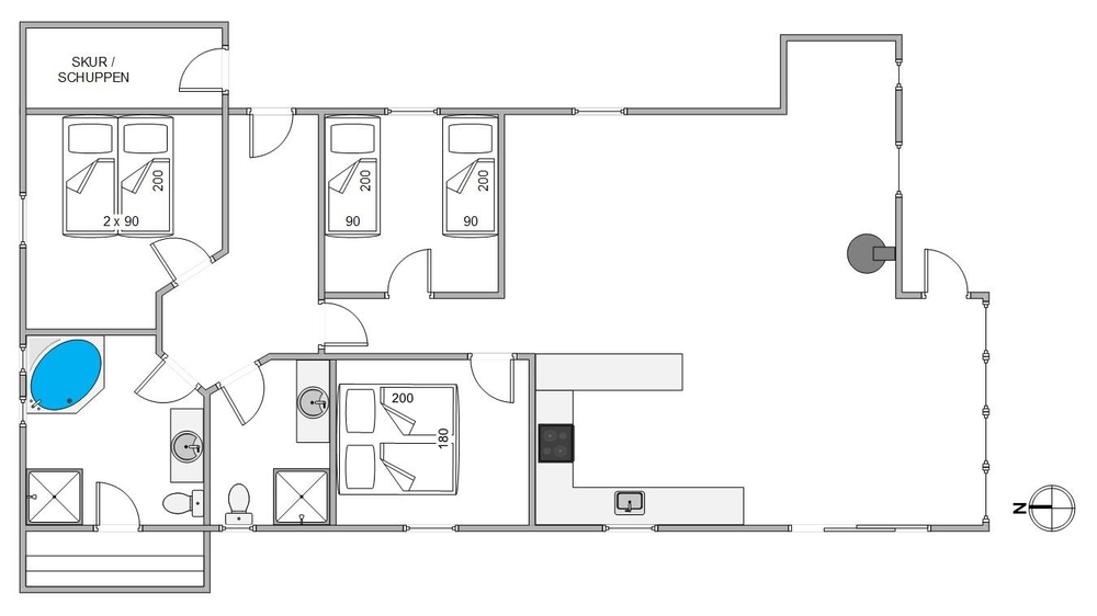 Die Lage des Ferienhauses macht den Alltag einfach und bequem, da die nächste Einkaufsmöglichkeit nur 4.500 Meter entfernt ist. Skodbjerge ist eine malerische Perle an der dänischen Westküste. Die Region ist bekannt für ihre beeindruckenden Dünenlandschaften und breiten Sandstrände, die sich so weit das Auge reichen. Skodbjerge bietet eine friedliche Atmosphäre, in der du die Natur hautnah erleben kannst ? ob bei langen Spaziergängen entlang der Küste, Radtouren durch die Dünen oder einfach beim Entspannen am Wasser. Diese idyllische Gegend gibt dir die Möglichkeit, Ruhe zu finden und Kraft zu tanken, sodass du erfrischt aus dem Urlaub zurückkehrst.