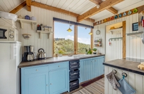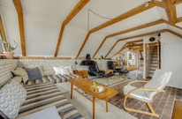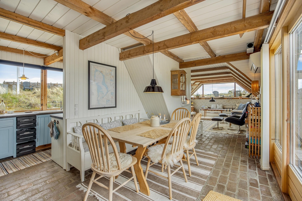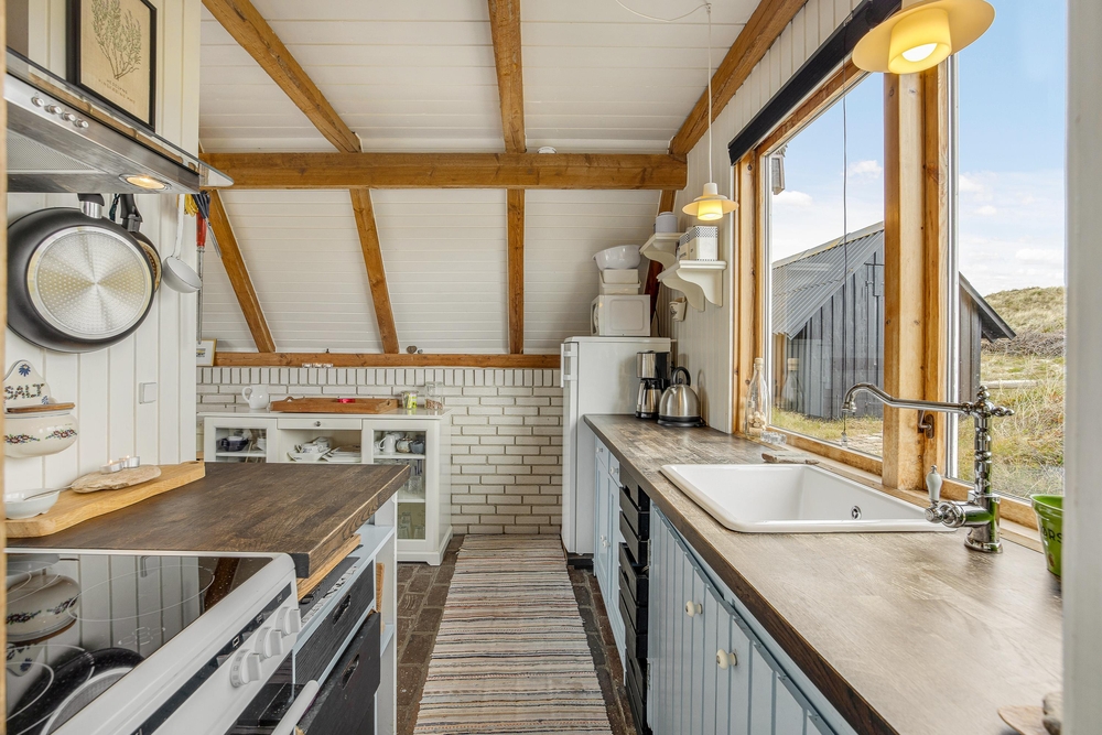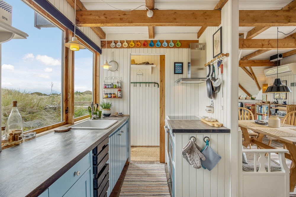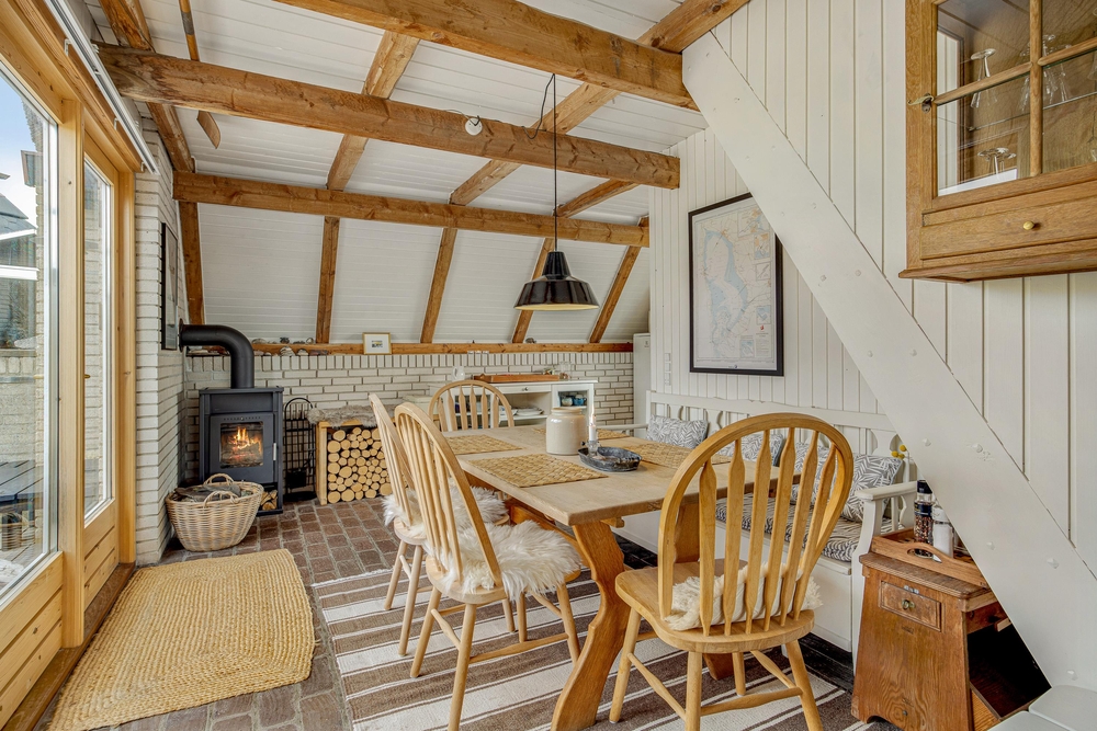 In diesem charmanten Sommerhus erwartet euch ein hyggeliger Wohn-Essbereich mit offener Küche. Die Einrichtung wurde mit viel Liebe zum Detail abgestimmt und strahlt absolute Gemütlichkeit aus. Der Kaminofen trägt zu dieser besonderen Atmosphäre bei. Lest ein gutes Buch auf dem gemütlichen Sofa und genießt das Hyggegefühl, das dieses einzigartige Ferienhaus ausstrahlt.