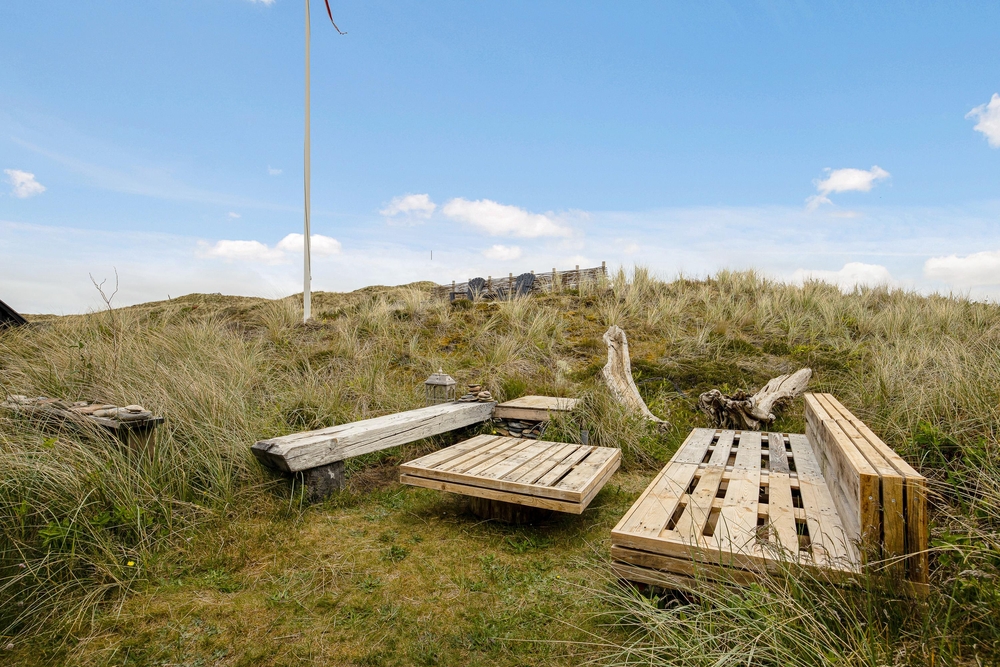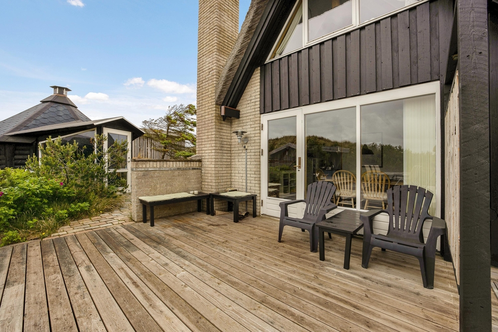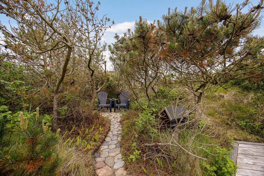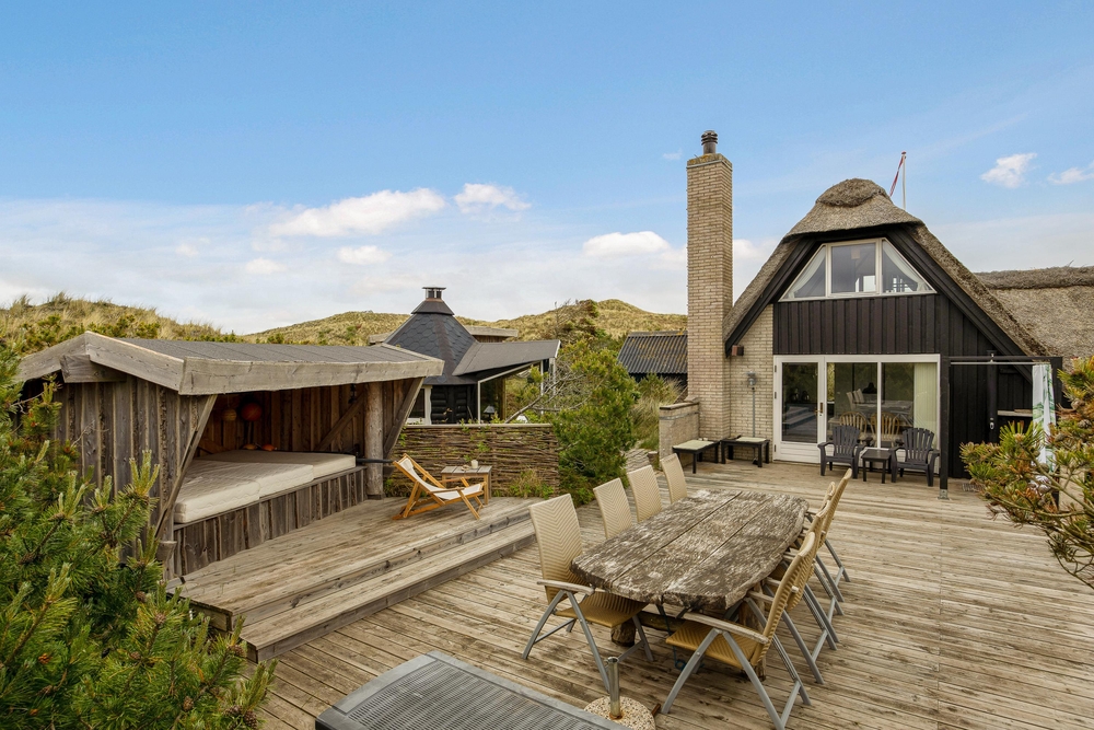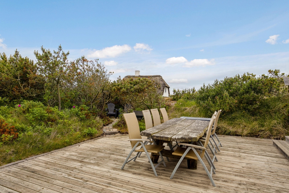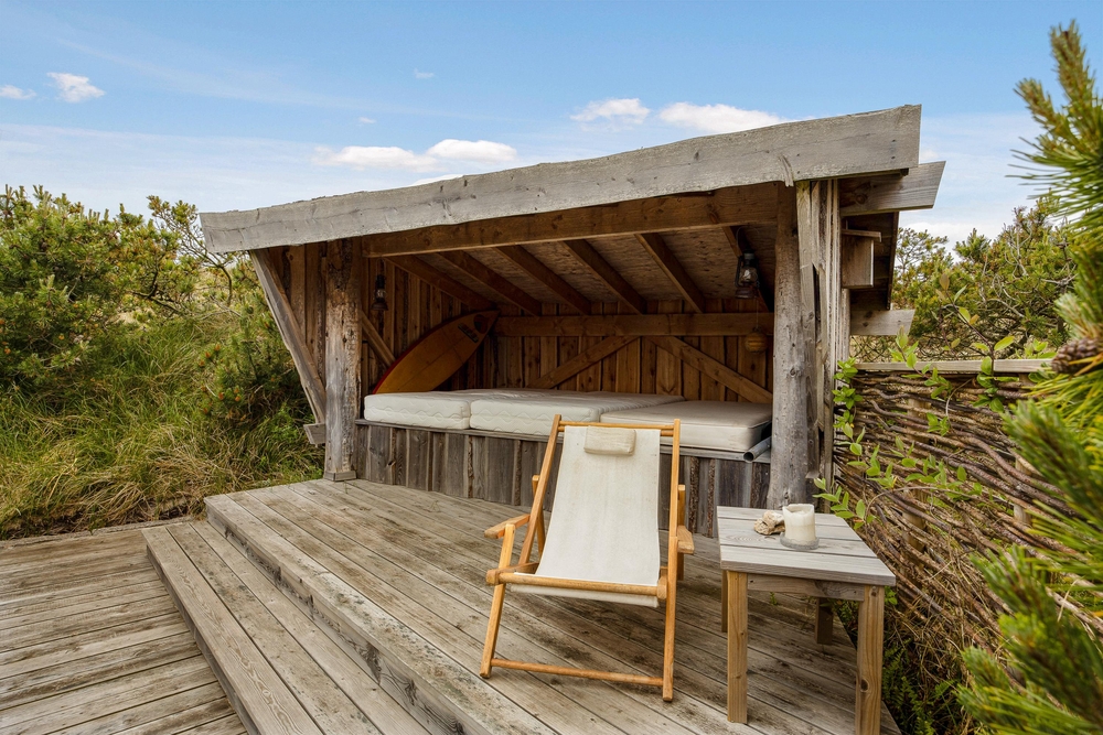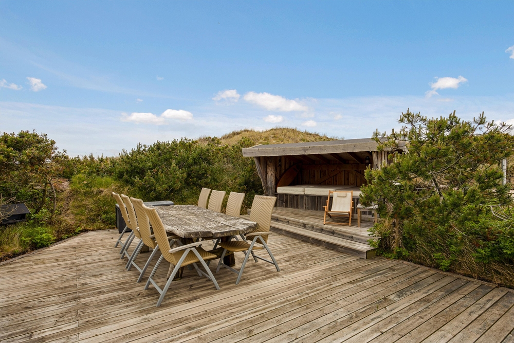 Der Außenbereich überzeugt durch ein 4000 qm großes Naturgrundstück mitten in den Dünen. Hier bieten sich viele Möglichkeiten zum hyggeligen Beisammensein. So gibt es hier eine großzügige und teils abgeschirmte Terrasse mit bequemen Möbeln und viele weitere Sitzecken auf dem Grundstück verteilt.