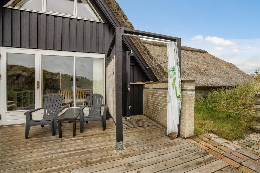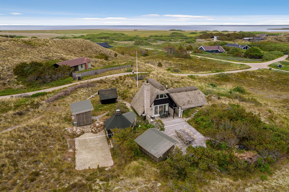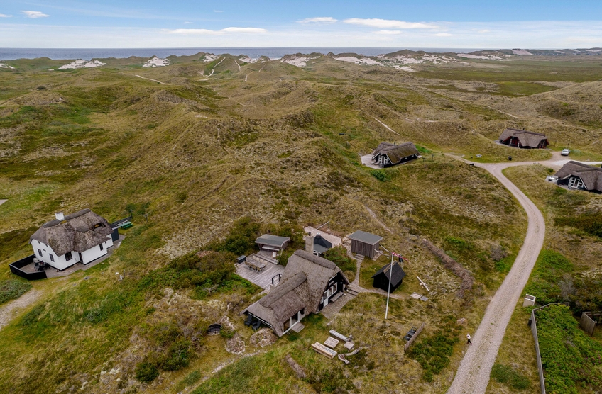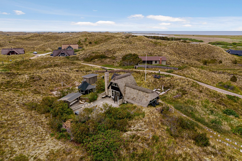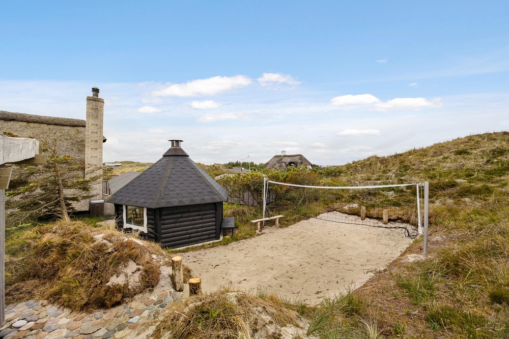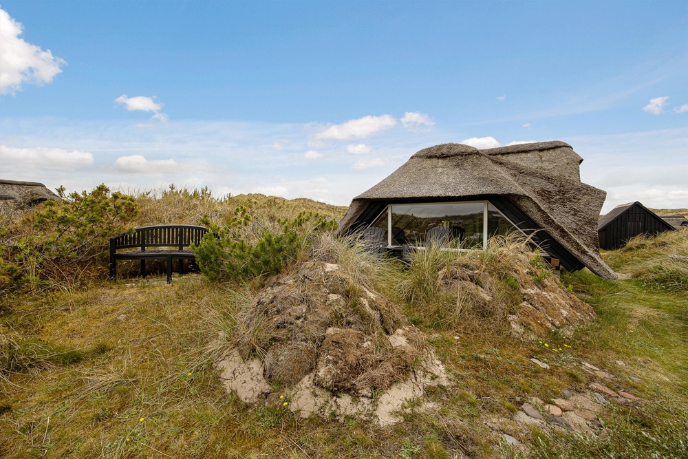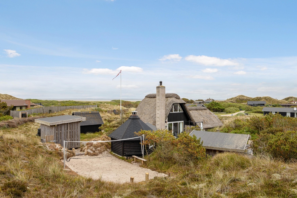 Der Außenbereich überzeugt durch ein 4000 qm großes Naturgrundstück mitten in den Dünen. Hier bieten sich viele Möglichkeiten zum hyggeligen Beisammensein. So gibt es hier eine großzügige und teils abgeschirmte Terrasse mit bequemen Möbeln und viele weitere Sitzecken auf dem Grundstück verteilt.
