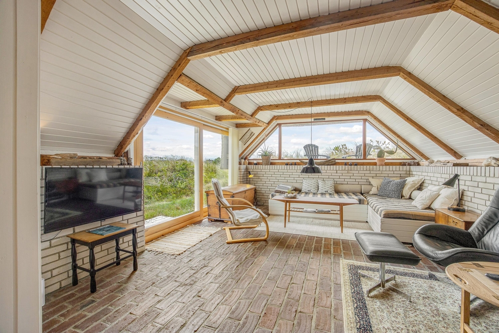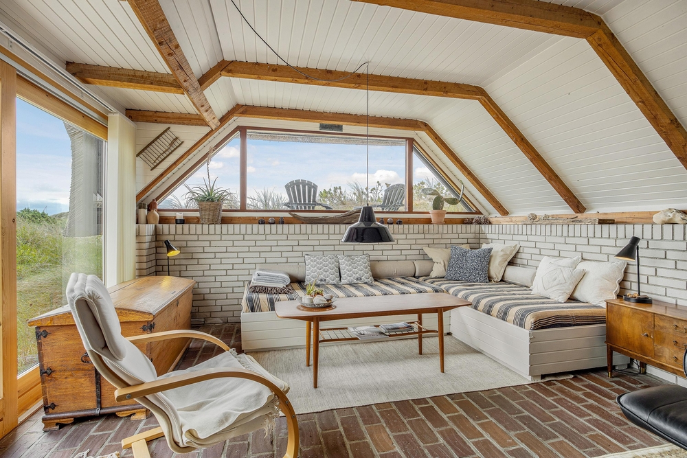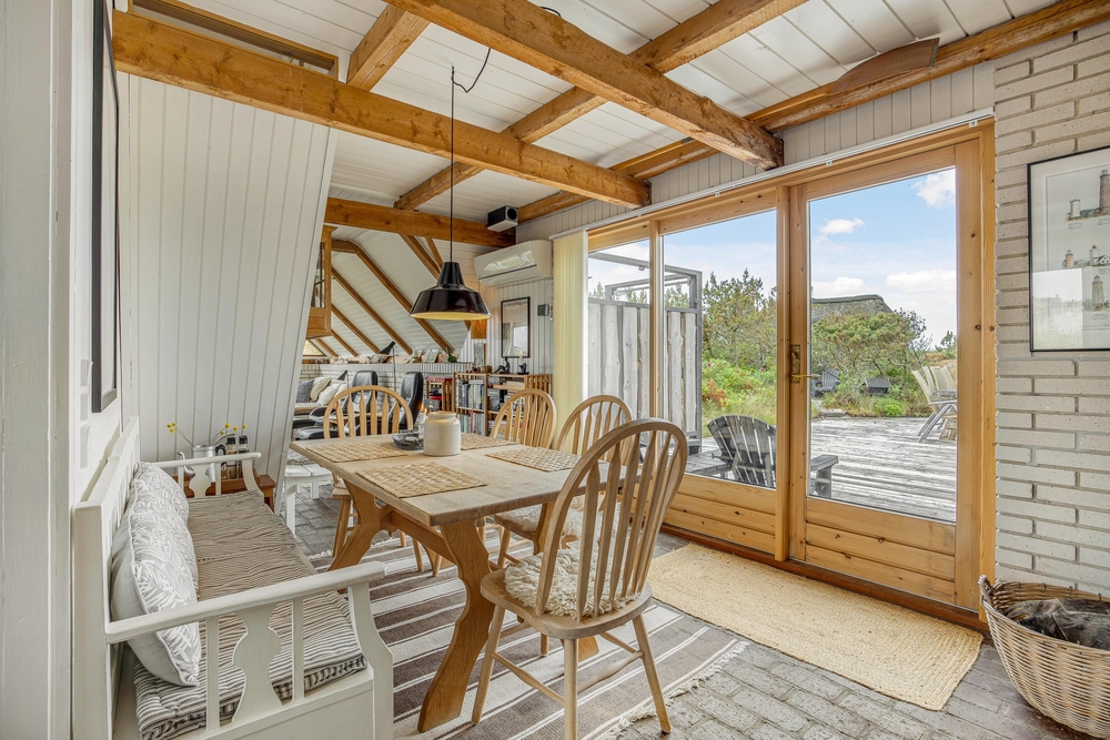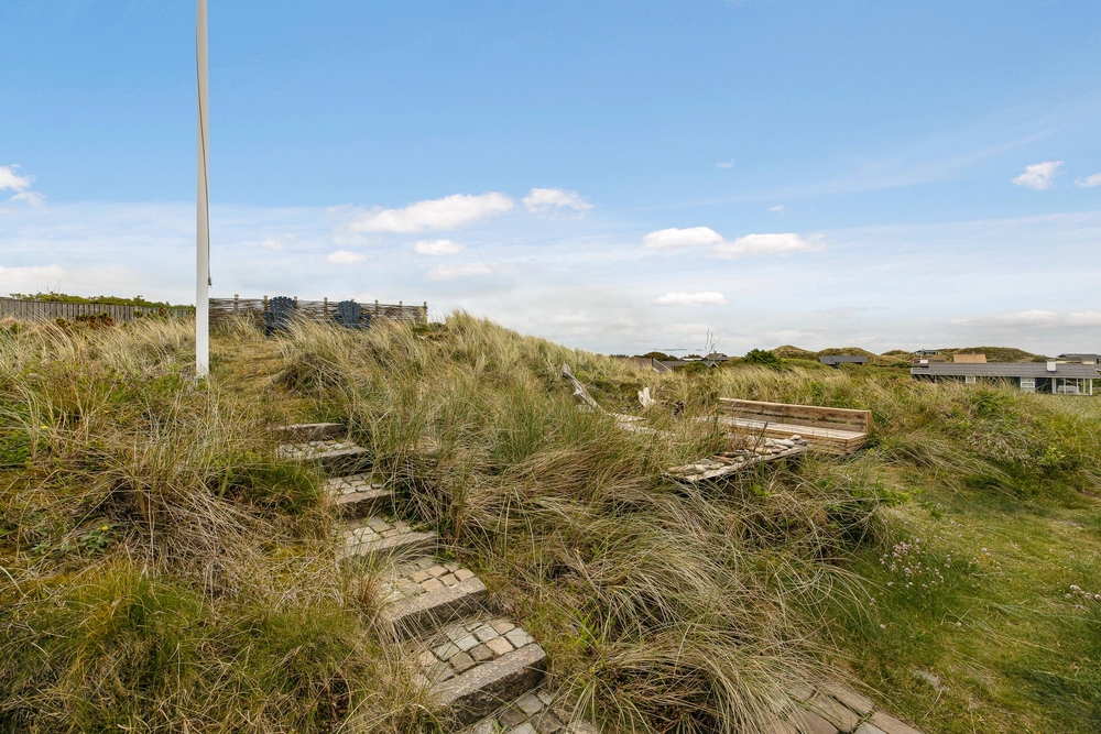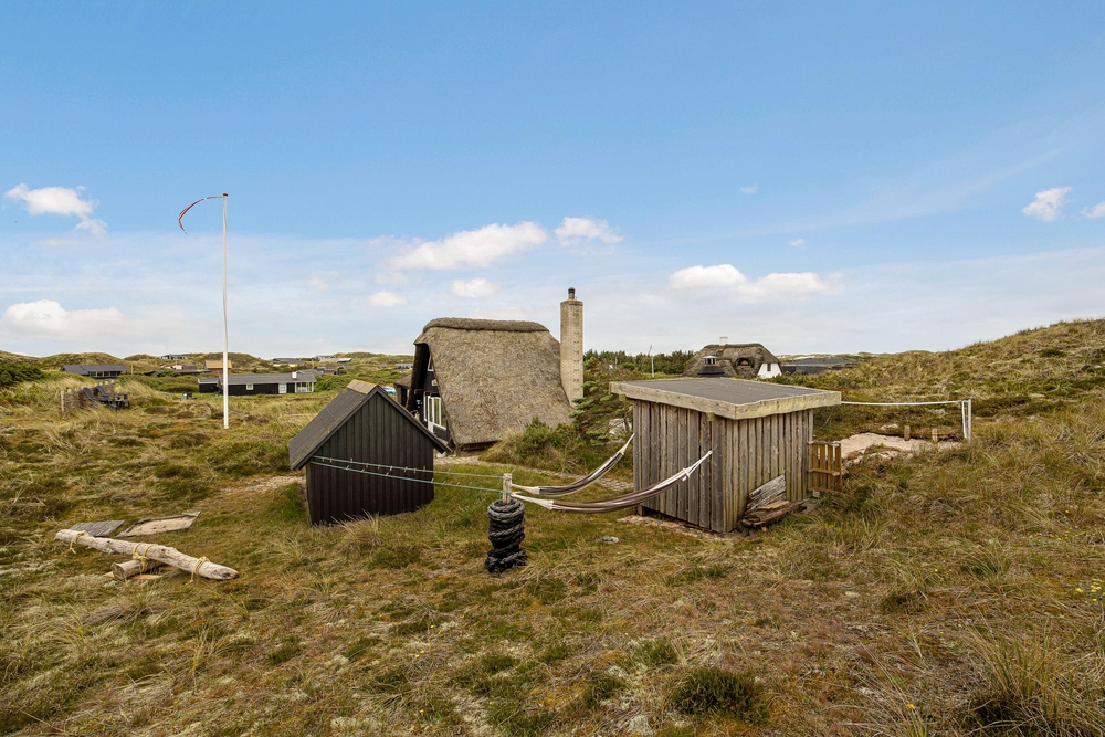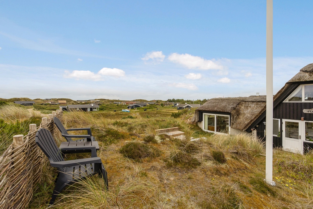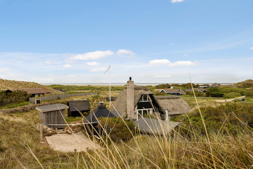 Der Außenbereich überzeugt durch ein 4000 qm großes Naturgrundstück mitten in den Dünen. Hier bieten sich viele Möglichkeiten zum hyggeligen Beisammensein. So gibt es hier eine großzügige und teils abgeschirmte Terrasse mit bequemen Möbeln und viele weitere Sitzecken auf dem Grundstück verteilt.