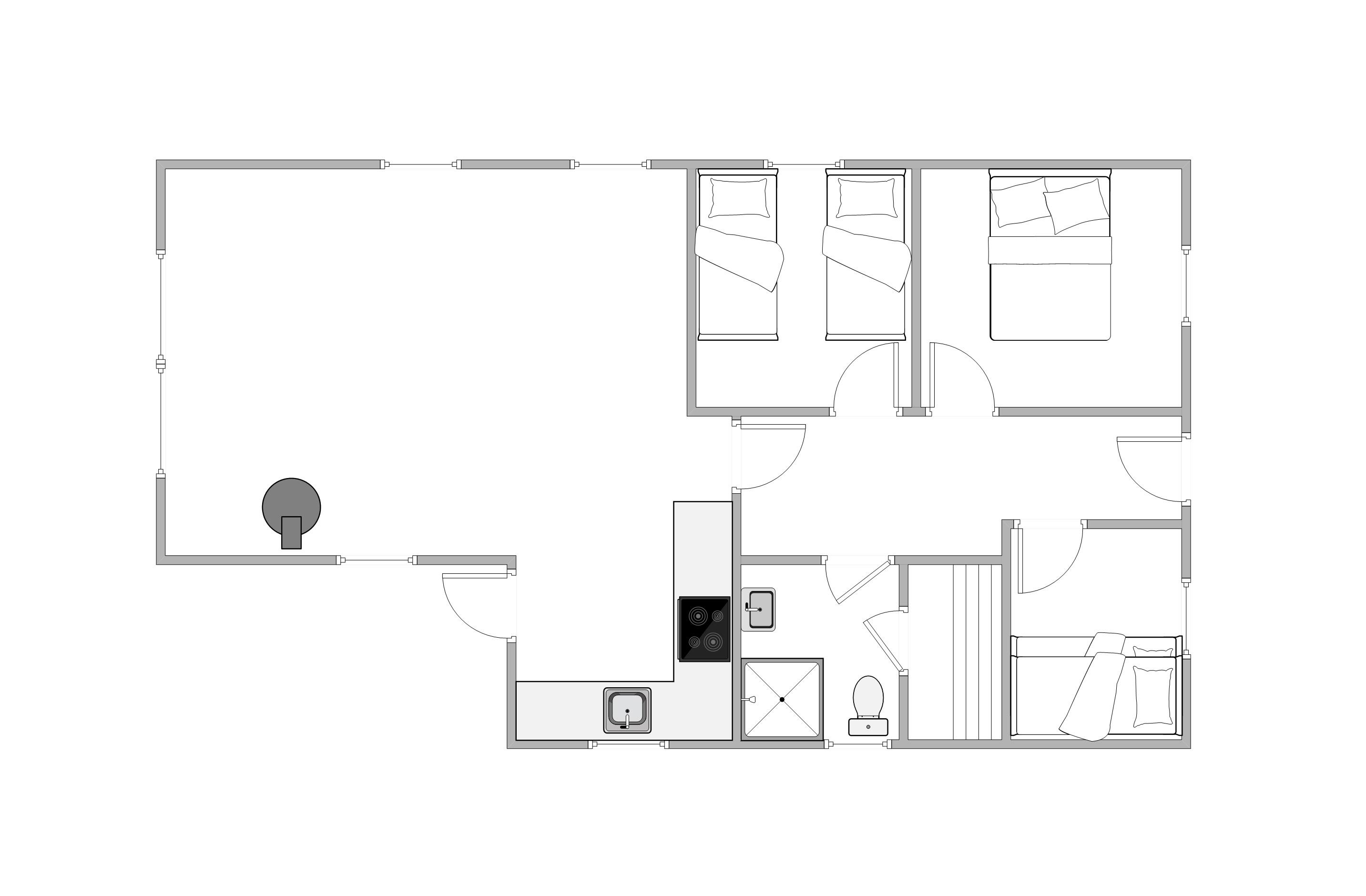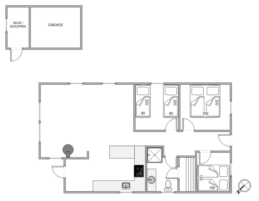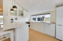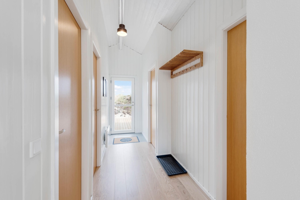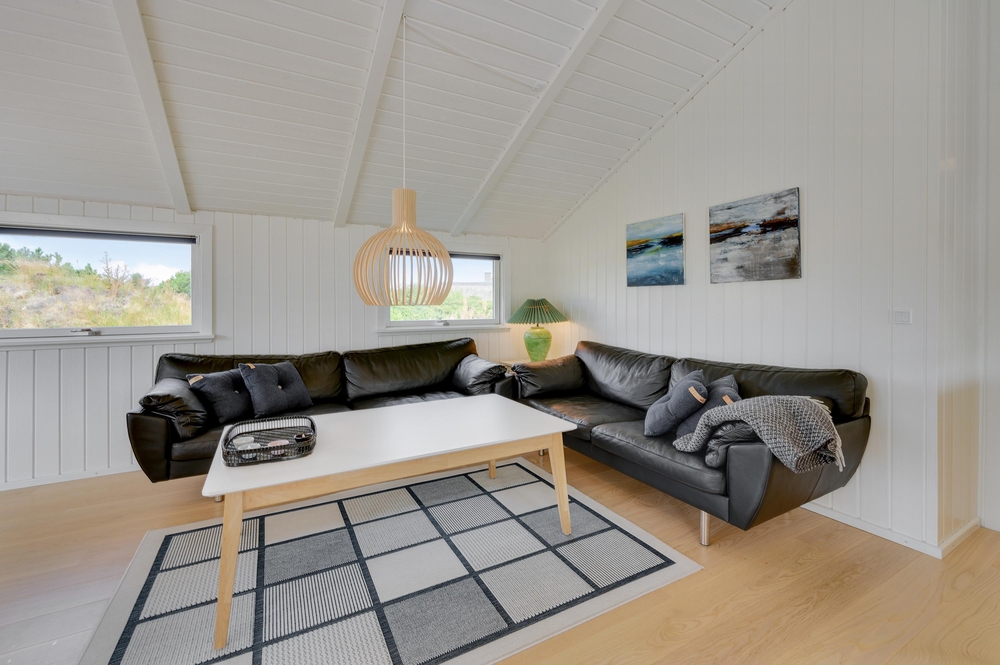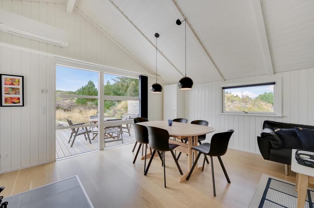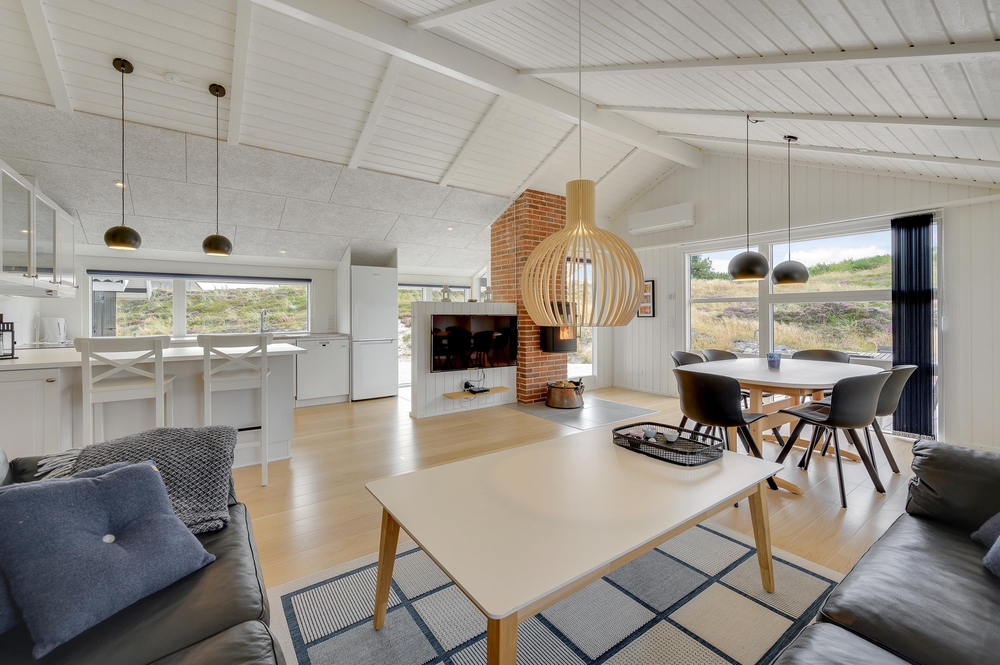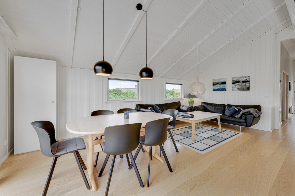 Das Ferienhaus ist modern und im skandinavischen Stil und mit schönem Holzfußboden eingerichtet. Durch die firsthohen Decken und die helle Gestaltung entsteht eine einladende und helle Atmosphäre.