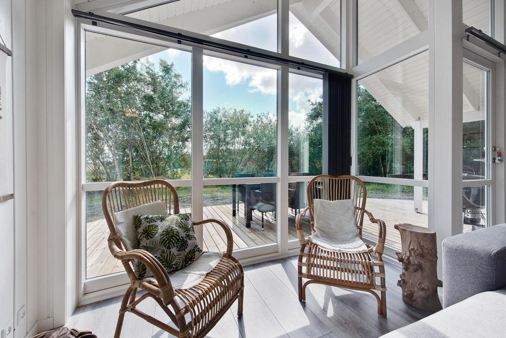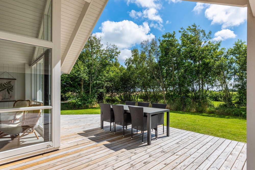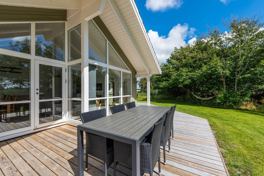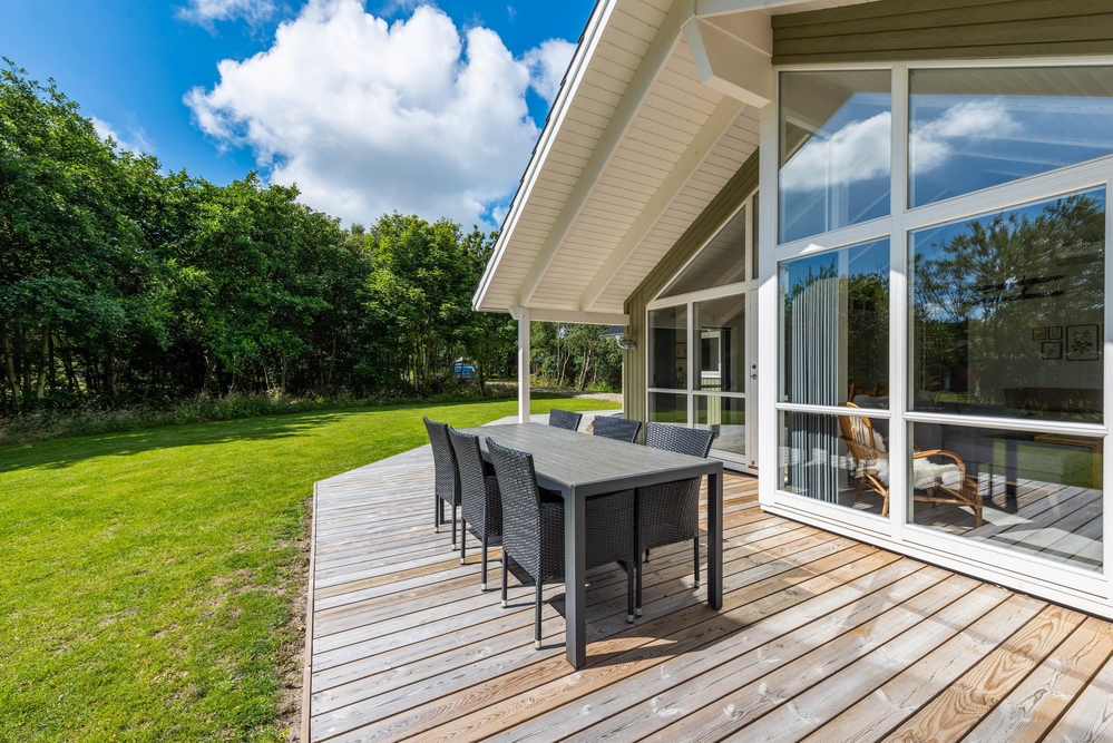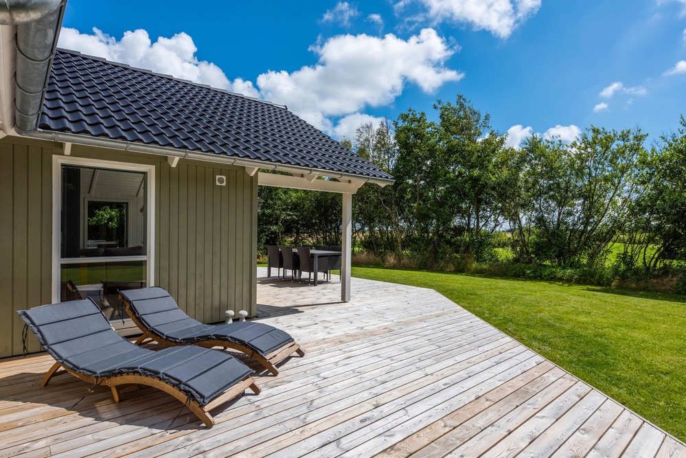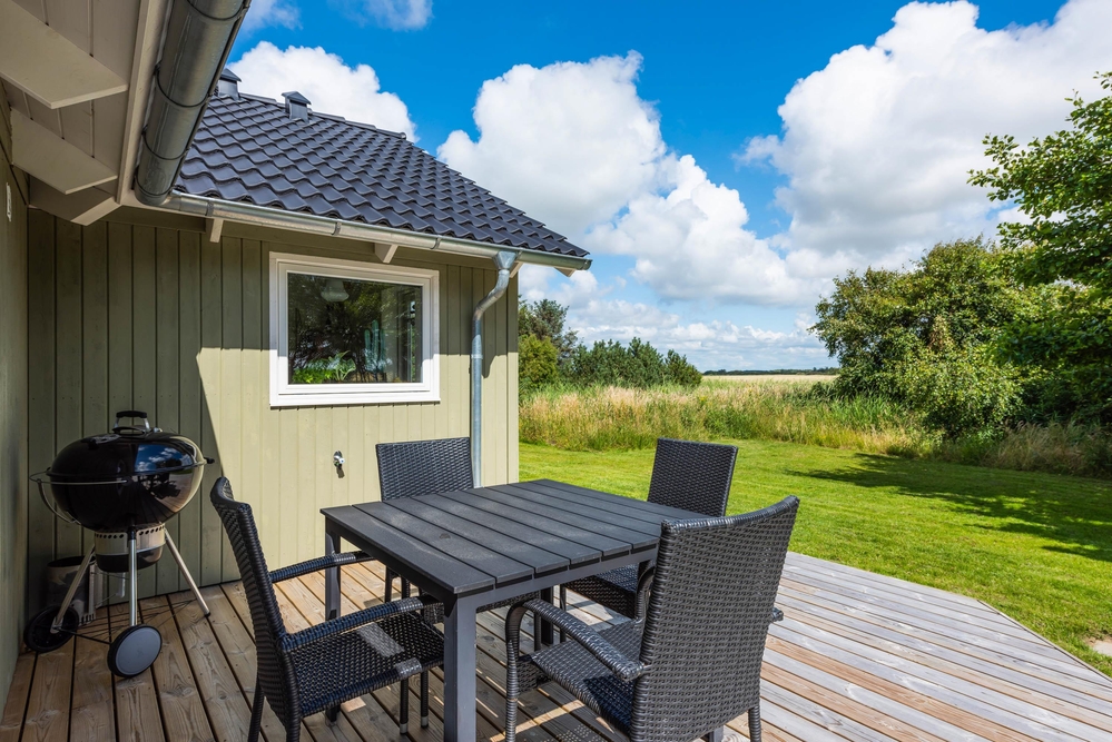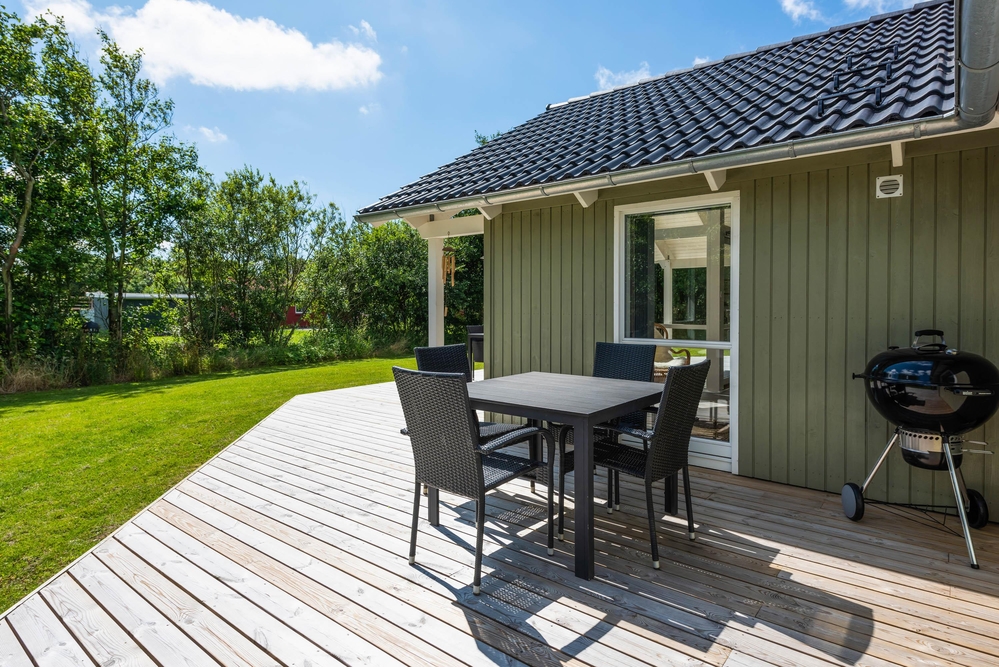 Auch draußen kann das Ferienhaus sich von seiner besten Seite zeigen. Rund um das Haus befindet sich die Terrasse, sodass du entweder mit der Sonne um das Haus wandern kannst oder dir einen schattigen Platz suchen kannst. Dazu kannst du dir eine der Sonnenliegen nehmen und es dir bei einem guten Buch und einer Tasse Kaffee gemütlich machen. Abends lädt der Grill zu leckerem Abendessen ein, das ihr im Freien zubereiten könnt.