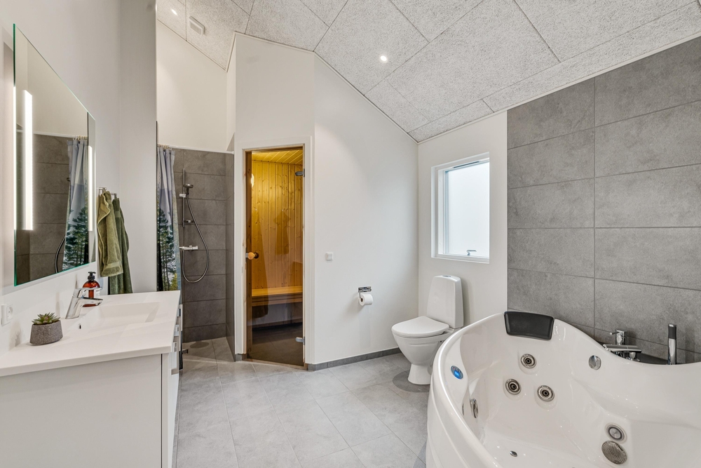Ein weiteres Highlight dieses Ferienhauses in Houstrup findet ihr in dem großen der 2 Badezimmer. Hier steht ein Wellness-Erlebnis im Whirlpool und in der Sauna auf dem Programm, wo ihr euch wunderbar entspannen könnt. Beide Bäder verfügen zusätzlich über eine Fußbodenheizung.