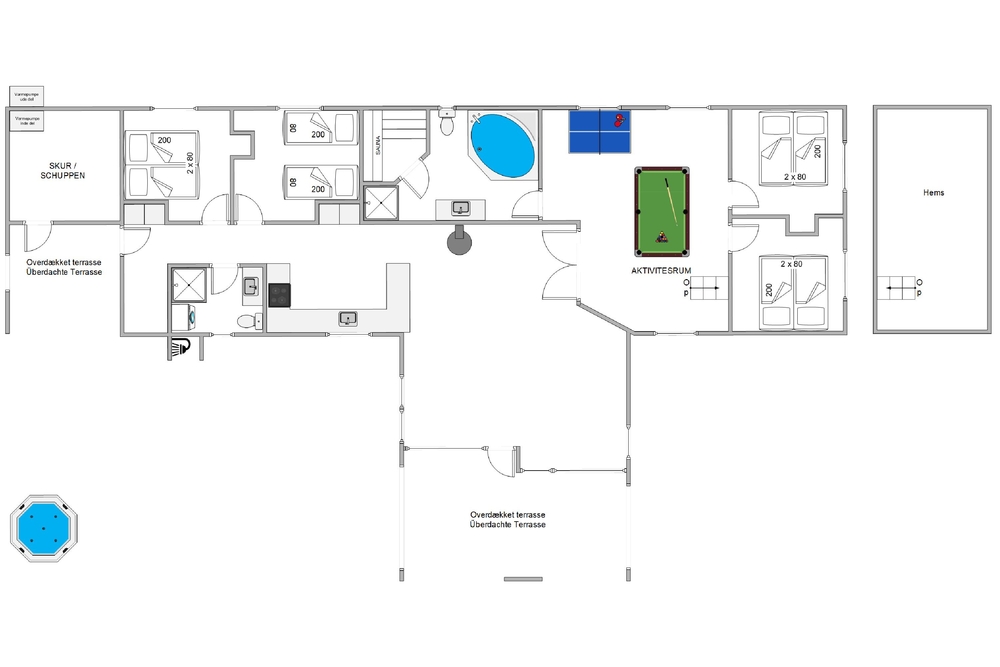 Der Aktivitätsraum des Ferienhauses wird zweifellos den Rahmen für viele unterhaltsame Momente der ganzen Familie bilden. Hier habt ihr die Möglichkeit Billard, Tischtennis und Tischfußball zu spielen, sodass für jeden etwas dabei sein sollte. Und warum nicht einen gemütlichen und lustigen Spieleabend mit leckeren Snacks und Getränken veranstalten?