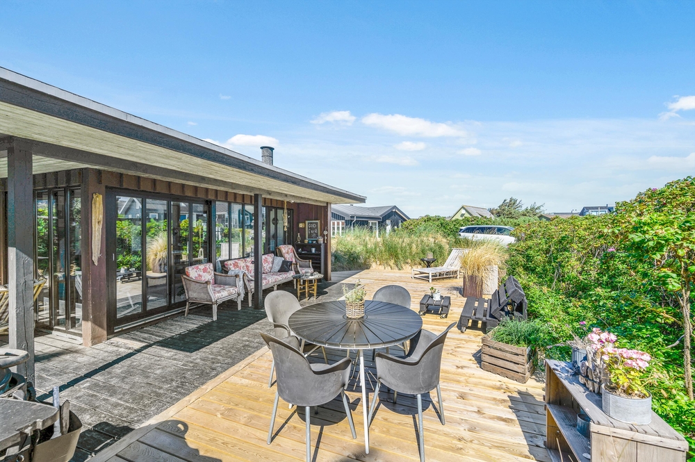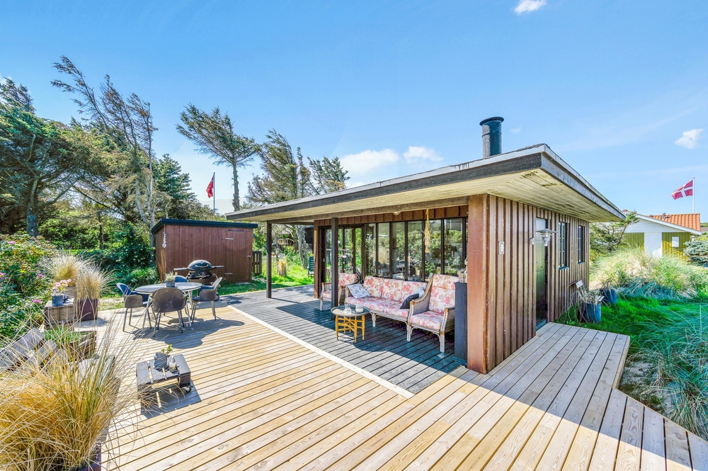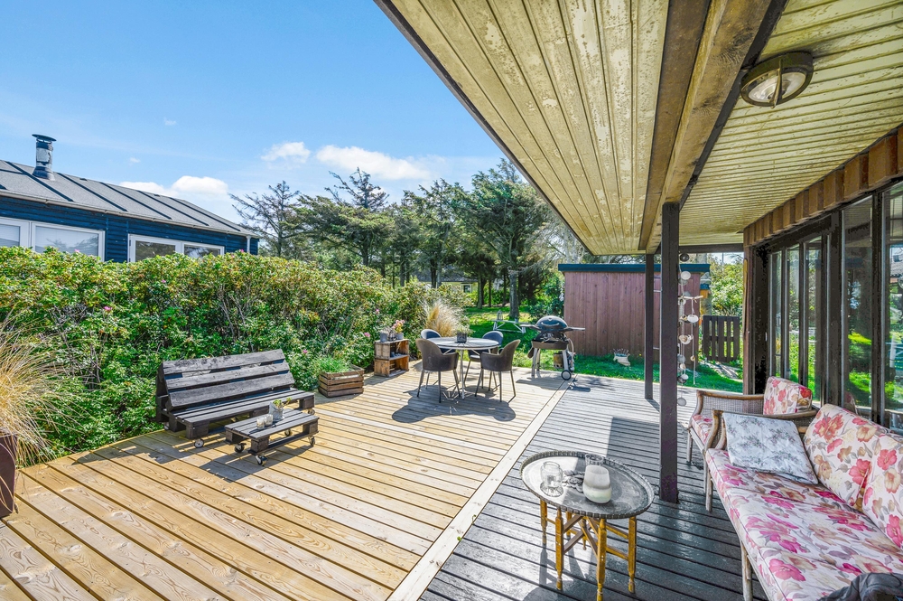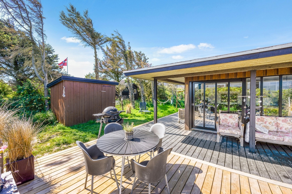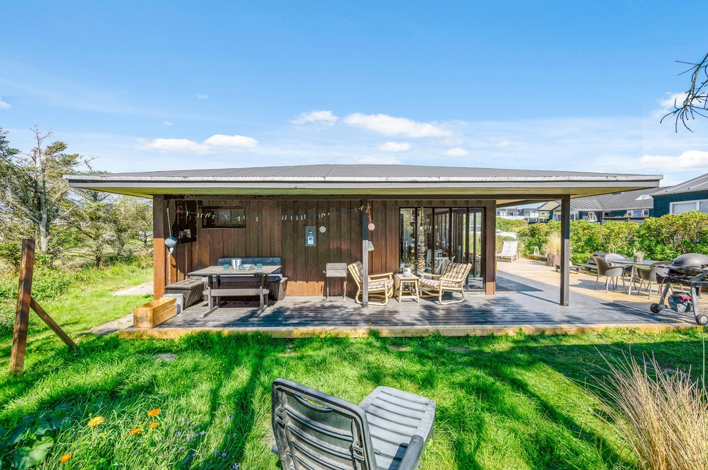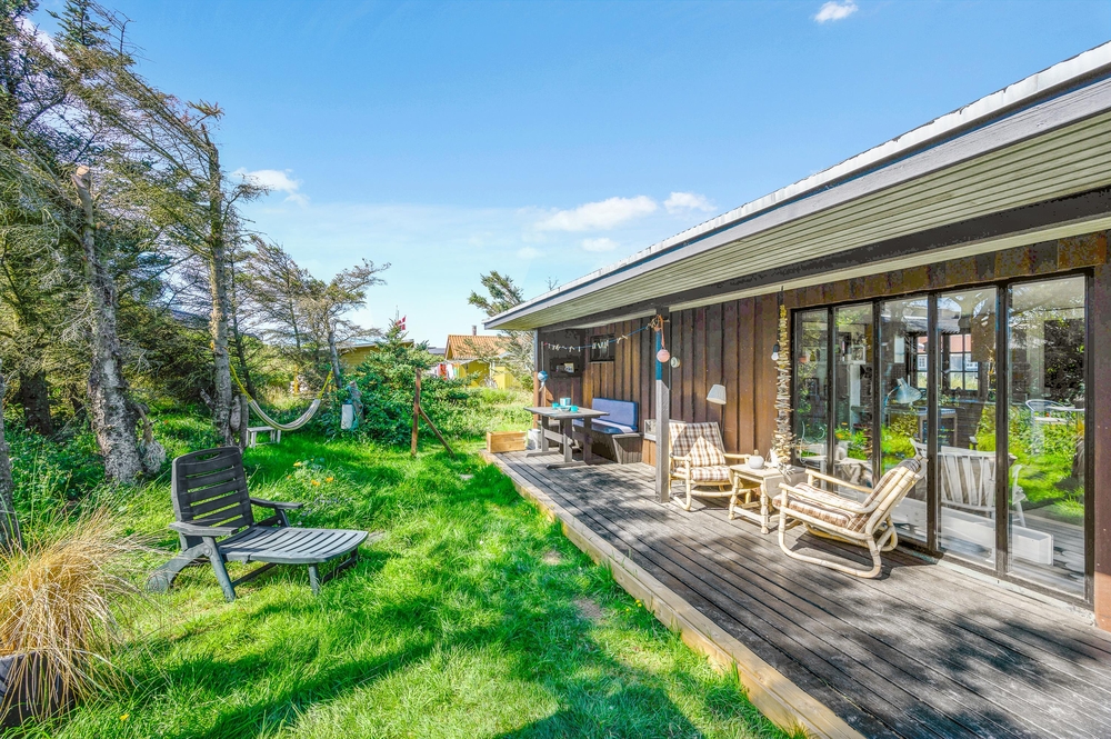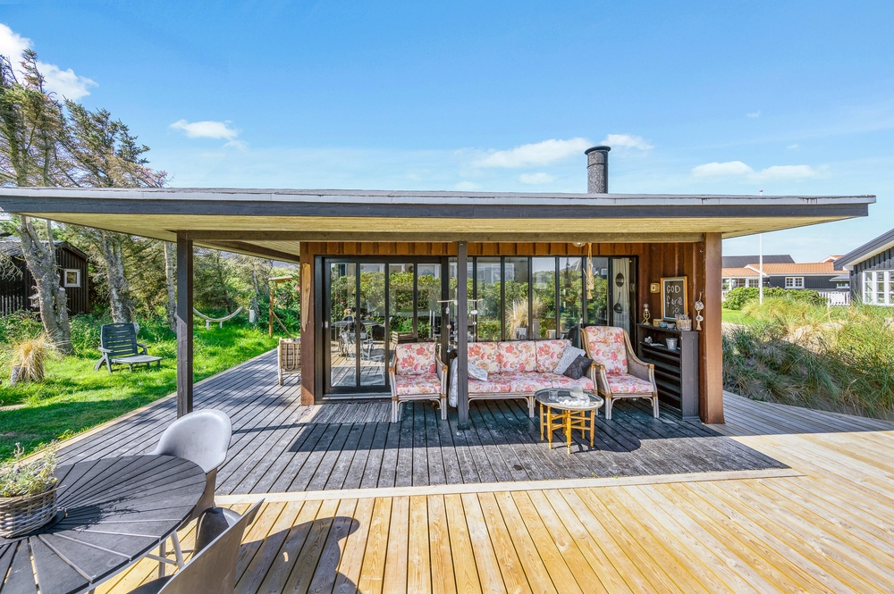 Das Haus besitzt natürlich auch eine schöne Terrasse, auf der ihr insbesondere an sonnigen Tagen viel Zeit verbringen könnt. Rund um das Ferienhaus findet ihr zahlreiche Sitzmöglichkeiten, sonnige und auch schattige sowie windgeschützt Plätze ? ganz nach Belieben. Die große Fensterfront lässt sich öffnen, sodass ihr gerade an sommerlichen Tagen einfach den Wohnbereich zur Terrasse hin öffnet.