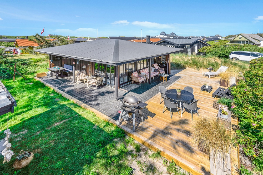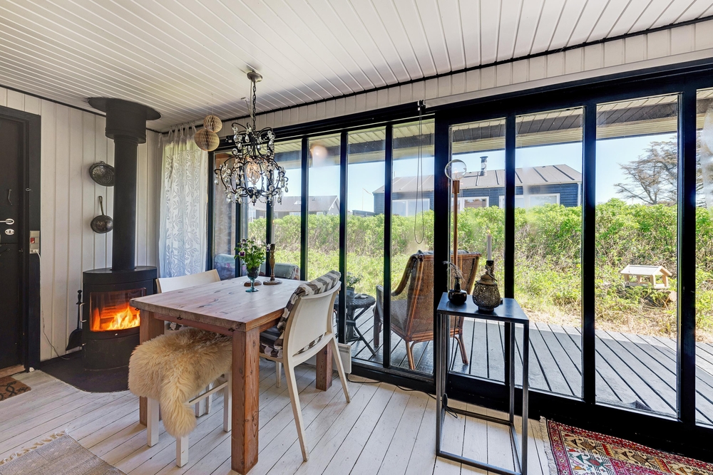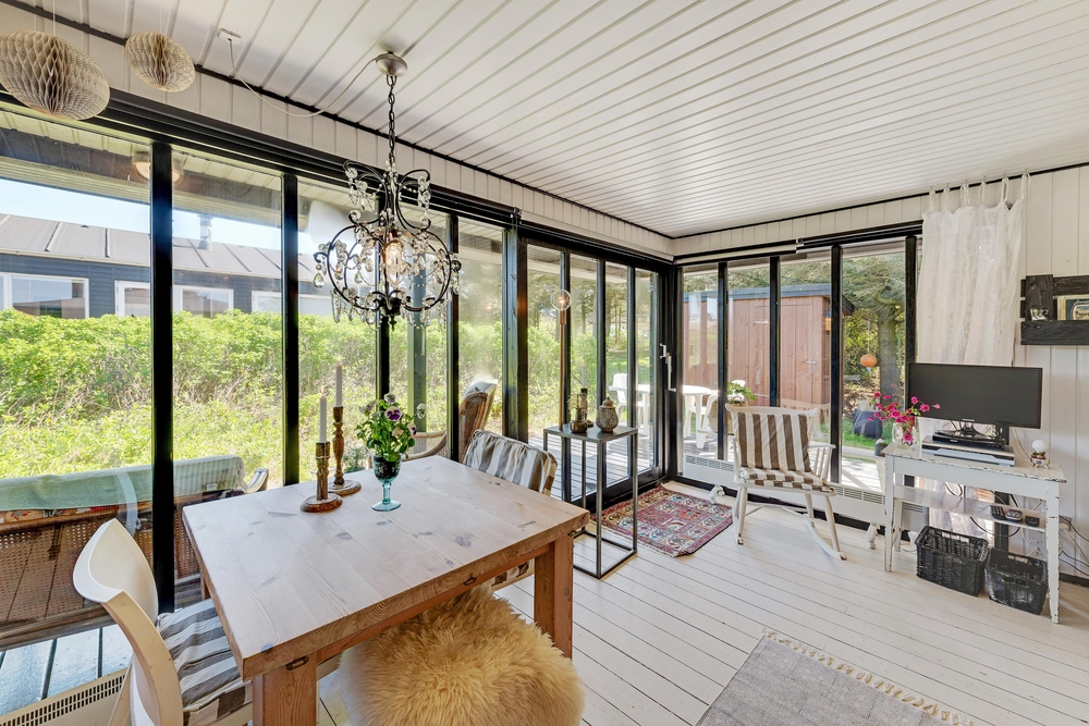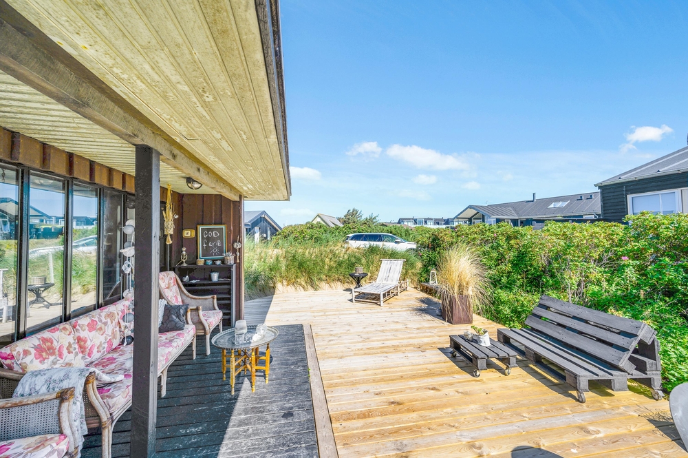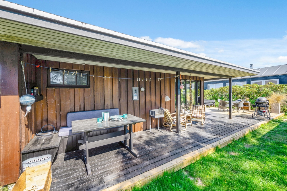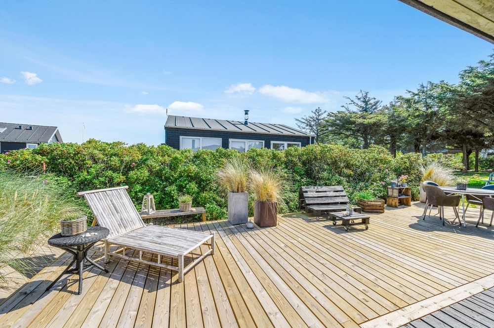 Das Haus besitzt natürlich auch eine schöne Terrasse, auf der ihr insbesondere an sonnigen Tagen viel Zeit verbringen könnt. Rund um das Ferienhaus findet ihr zahlreiche Sitzmöglichkeiten, sonnige und auch schattige sowie windgeschützt Plätze ? ganz nach Belieben. Die große Fensterfront lässt sich öffnen, sodass ihr gerade an sommerlichen Tagen einfach den Wohnbereich zur Terrasse hin öffnet.