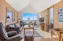 Neben der Sauna und dem Whirlpool verfügt die Ferienwohnung auch über ein gemütliches Wohnzimmer, in dem du dich entspannen und abschalten kannst. Mach es dir auf der bequemen Couch gemütlich und genieße das Ambiente des Ferienhauses. Dank der großen Fensterfronten hast du einen traumhaften Ausblick auf den Fjord.