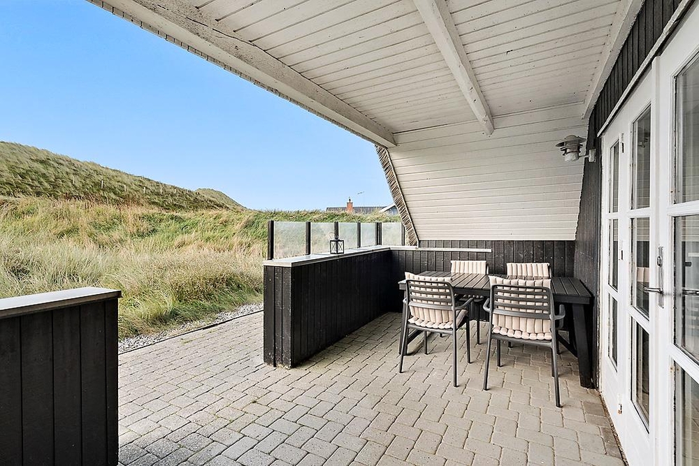 Die offenen, teilweise überdeckte Terrassen mit Blick auf die Dünen bietet viel Platz, da ihr von fast allen Seiten des Ferienhauses die Sonne genießen könnt. Außerdem sind diese von der Straße abgeschirmt und somit nicht direkt von dort einsehbar.