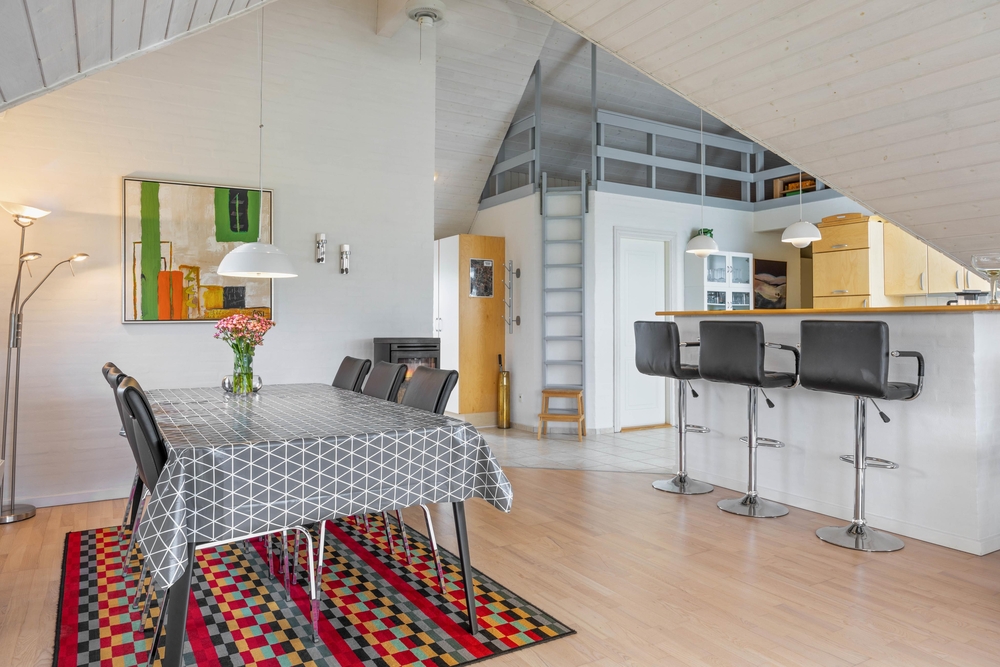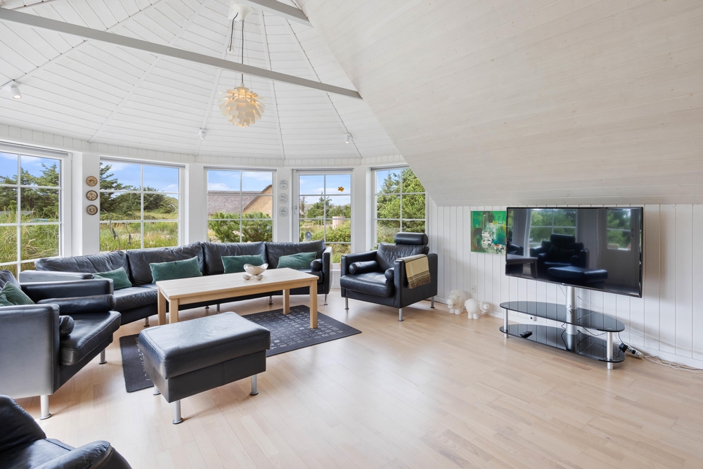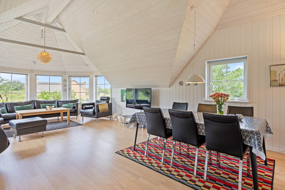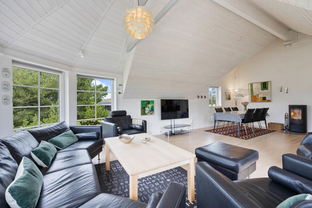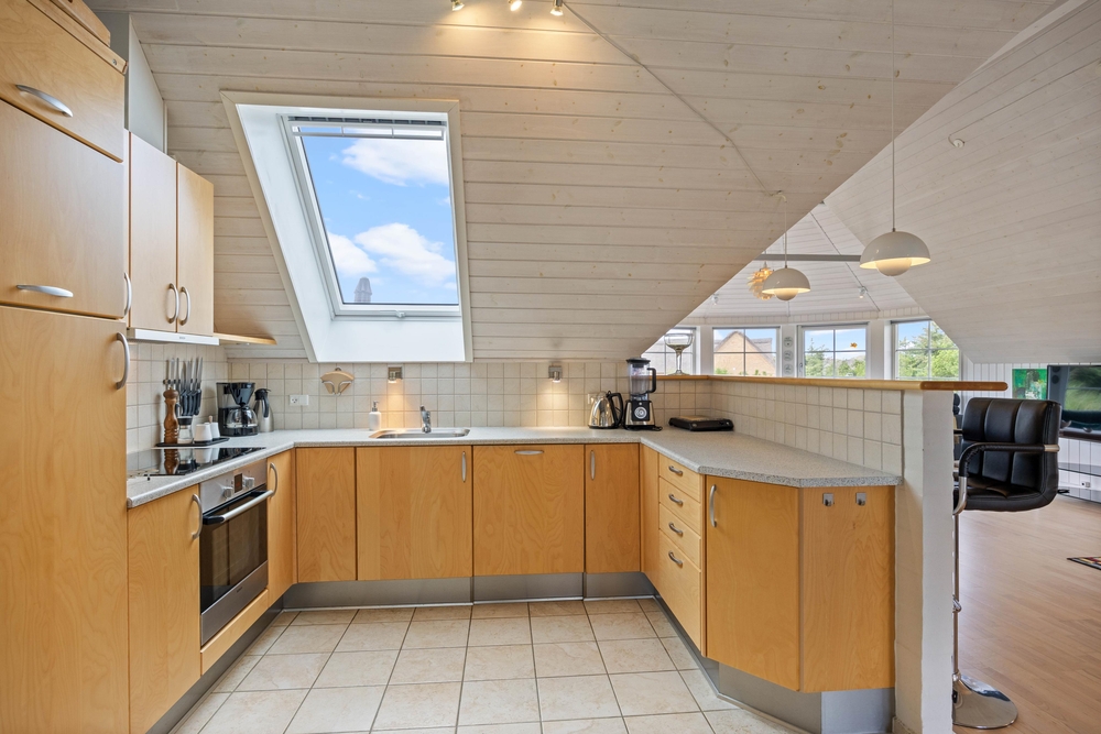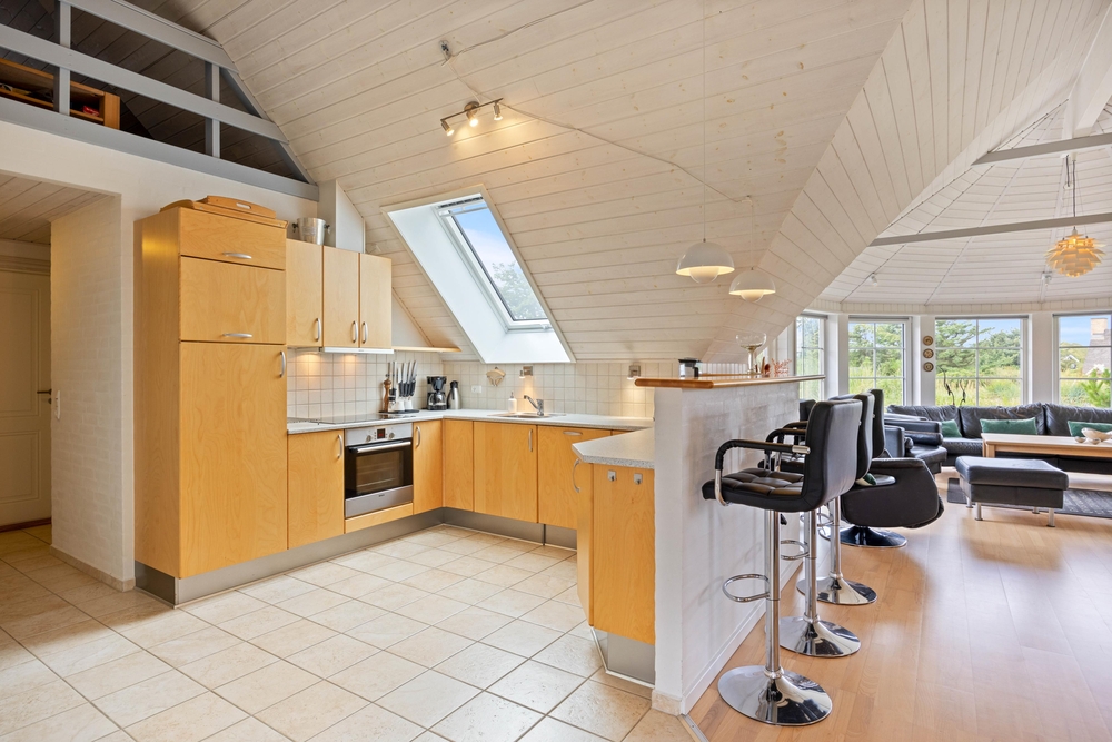 Die gut ausgestattete Küche ist mit dem hellen Wohnraum verbunden und bildet das Herz des Ferienhauses, wo die ganze Familie beisammen sein kann. Durch die helle Einrichtung und die hohen Decken wirkt das Haus noch größer und heller. Man fühlt sich hier schnell zu Hause und durch die großen Fenster kann man auch vom Sofa der Natur ganz nah sein.