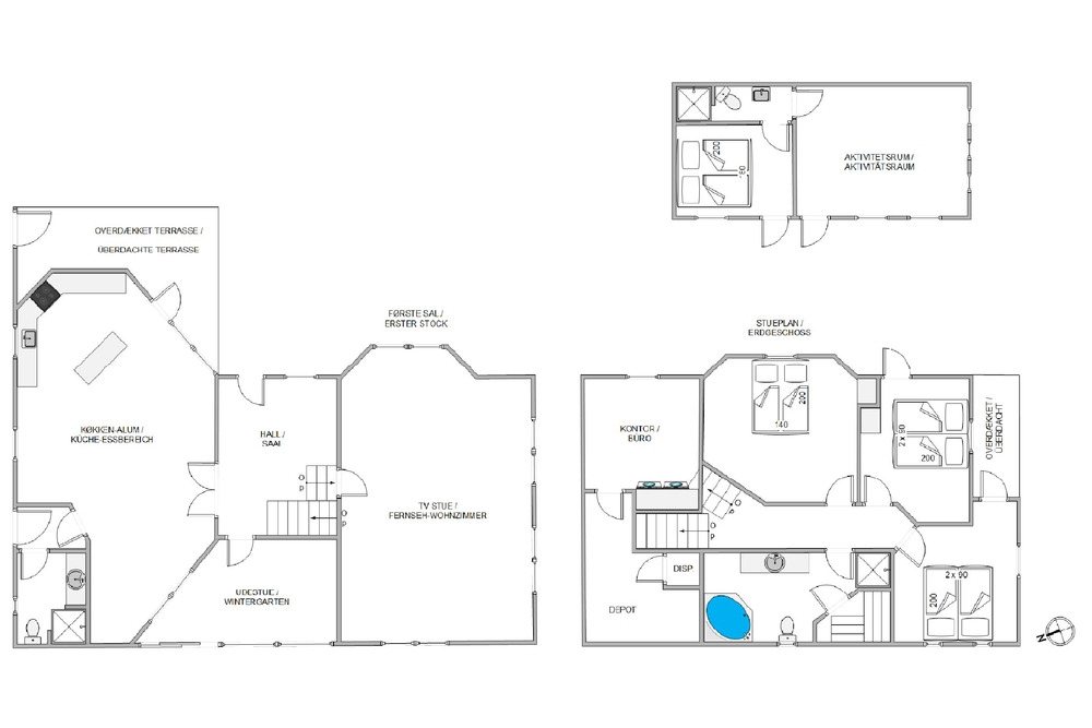3 der Schlafzimmer befinden sich im Ferienhaus, das 4. Schlafzimmer ist im Nebengebäude, welches auch über ein Badezimmer verfügt. In 2 der Schlafzimmer gibt es verstellbare, hochwertige Betten.