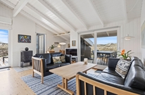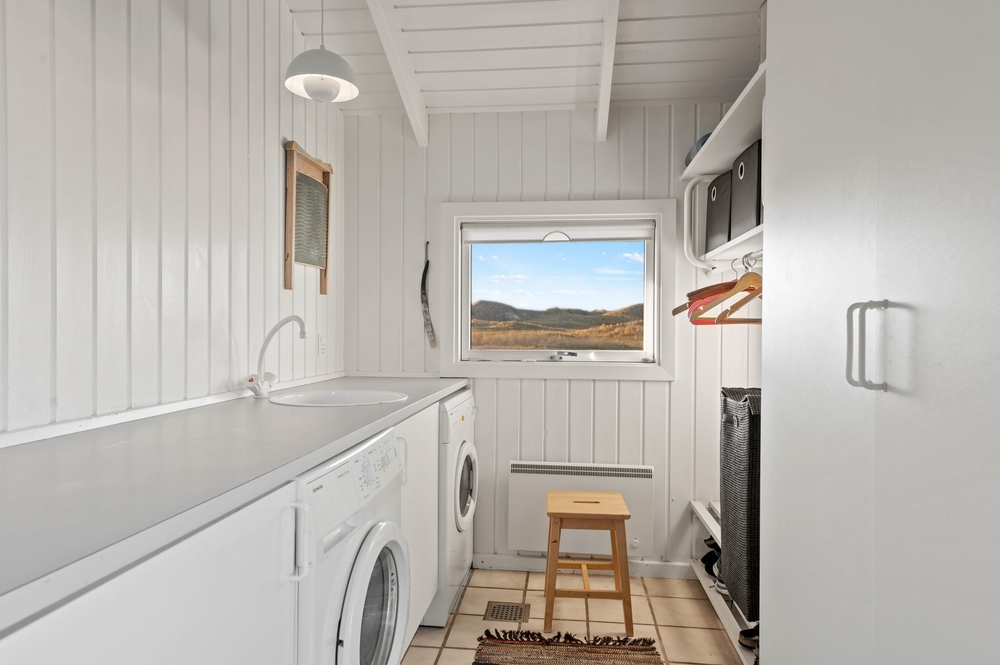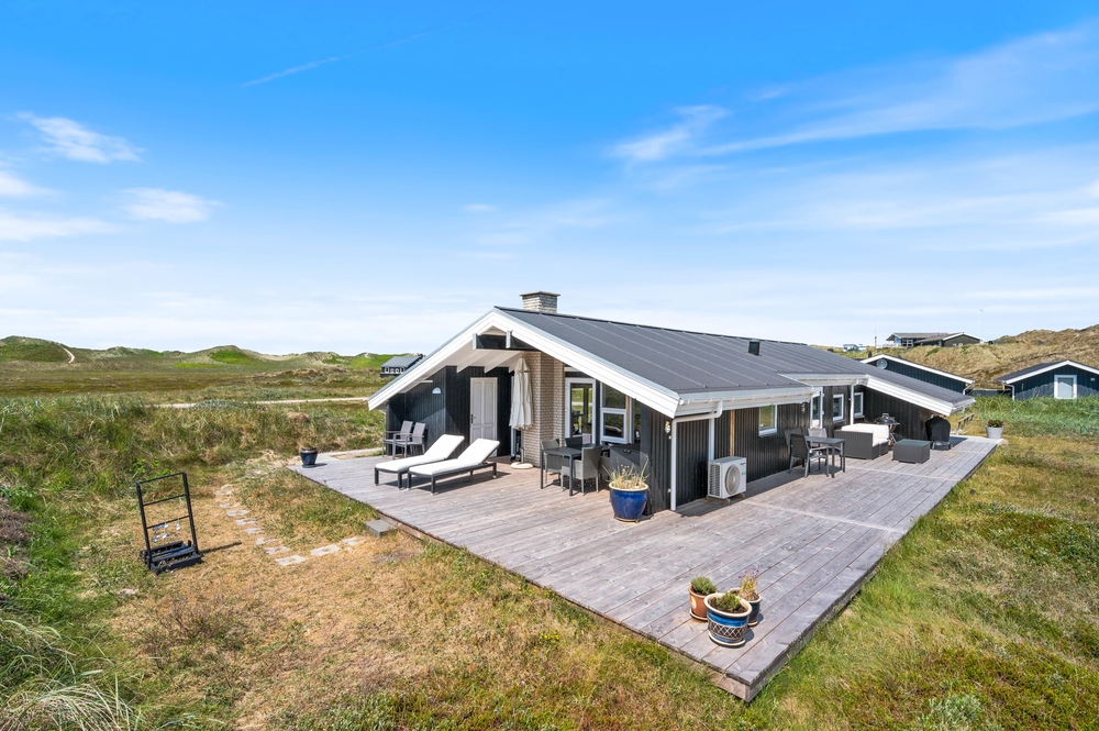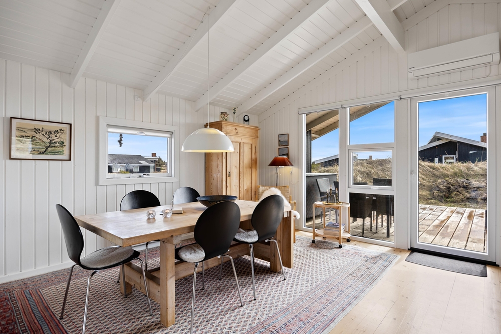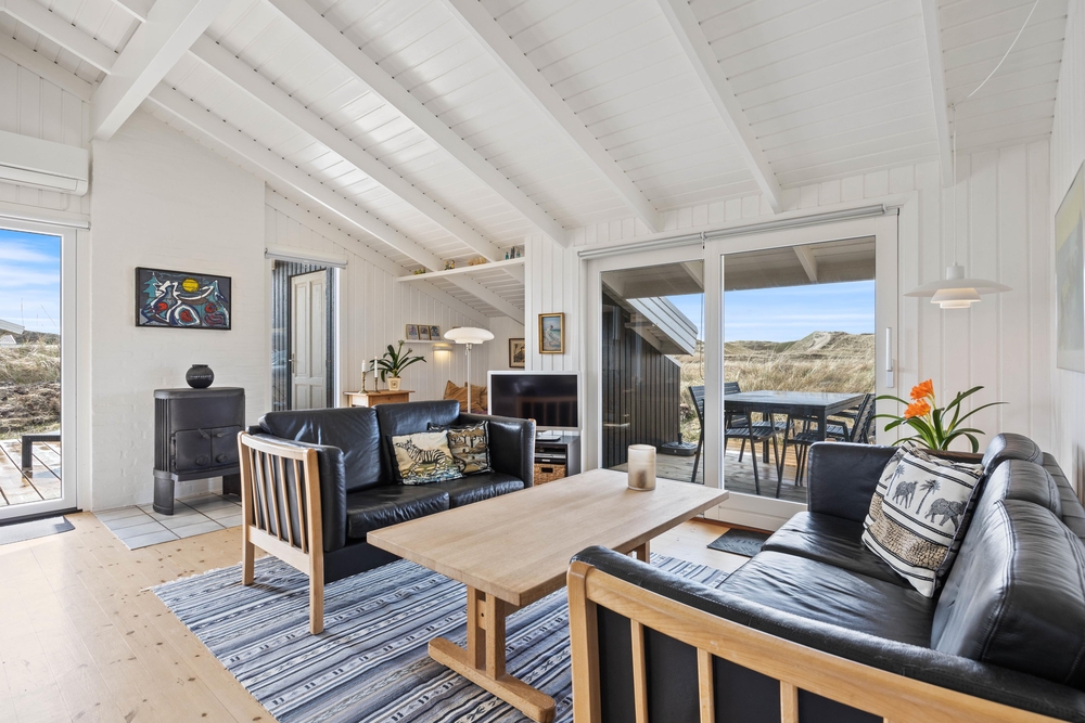 Ein besonderes Highlight im Wohnraum ist der Alkoven, wo man es sich gemütlich machen und sich in ein spannendes Buch vertiefen kann, während man dem Knistern des Feuers im Holzofen lauscht. Der Holzofen im Ferienhaus spendet wohlige Wärme, während er auch für die typische Ferienhausstimmung sorgt. Neben dem Holzofen sorgt die energiefreundliche Luft-zu-Luft Wärmepumpe für ein angenehmes Raumklima. Die Fenster im Wohnraum lassen nicht nur viel Tageslicht hinein, sondern bieten euch auch einen Panoramaausblick auf die Dünenlandschaft in Houvig.