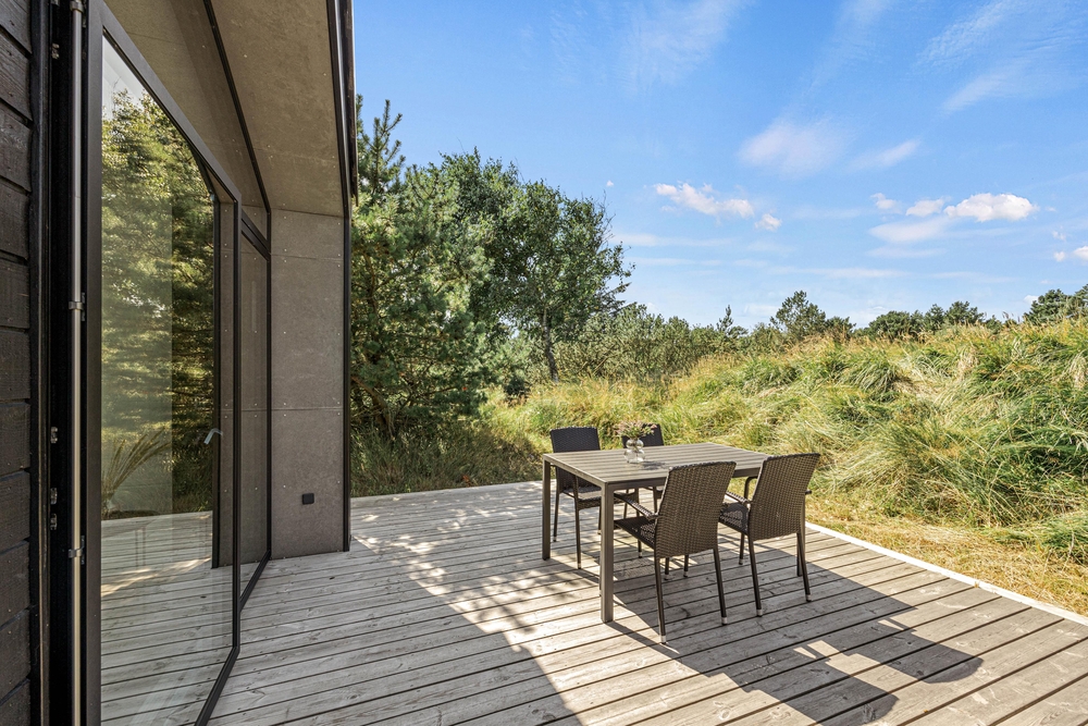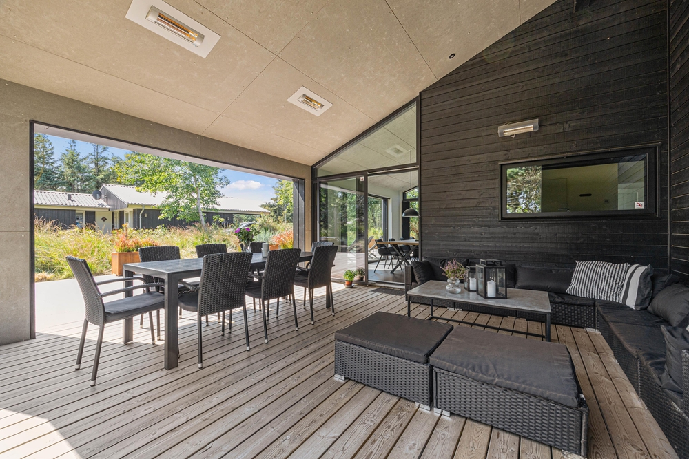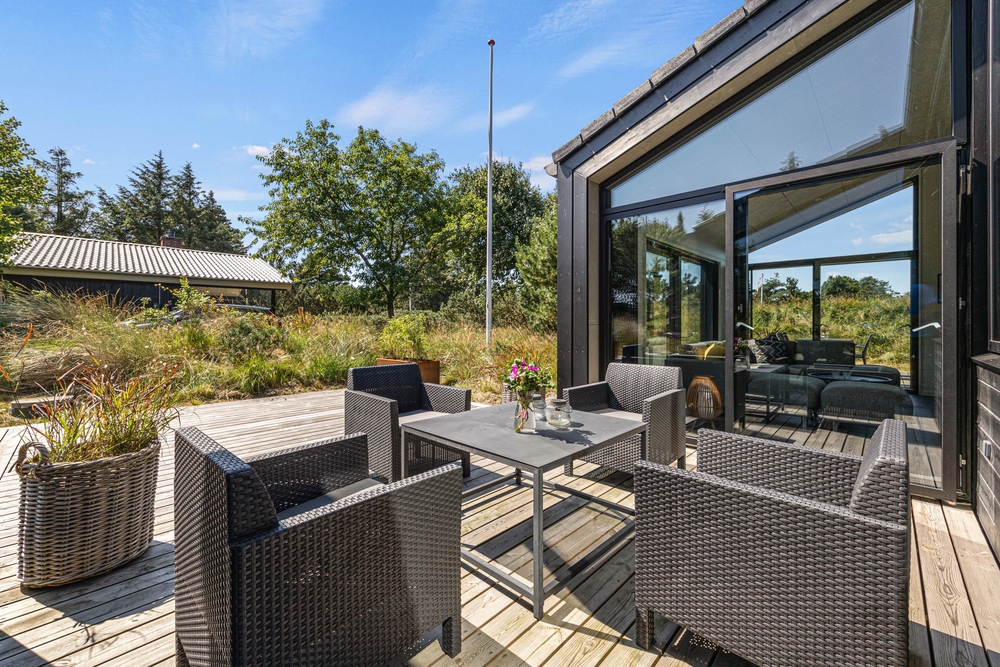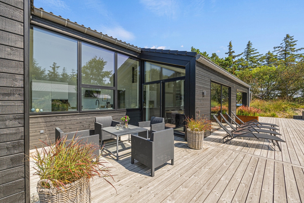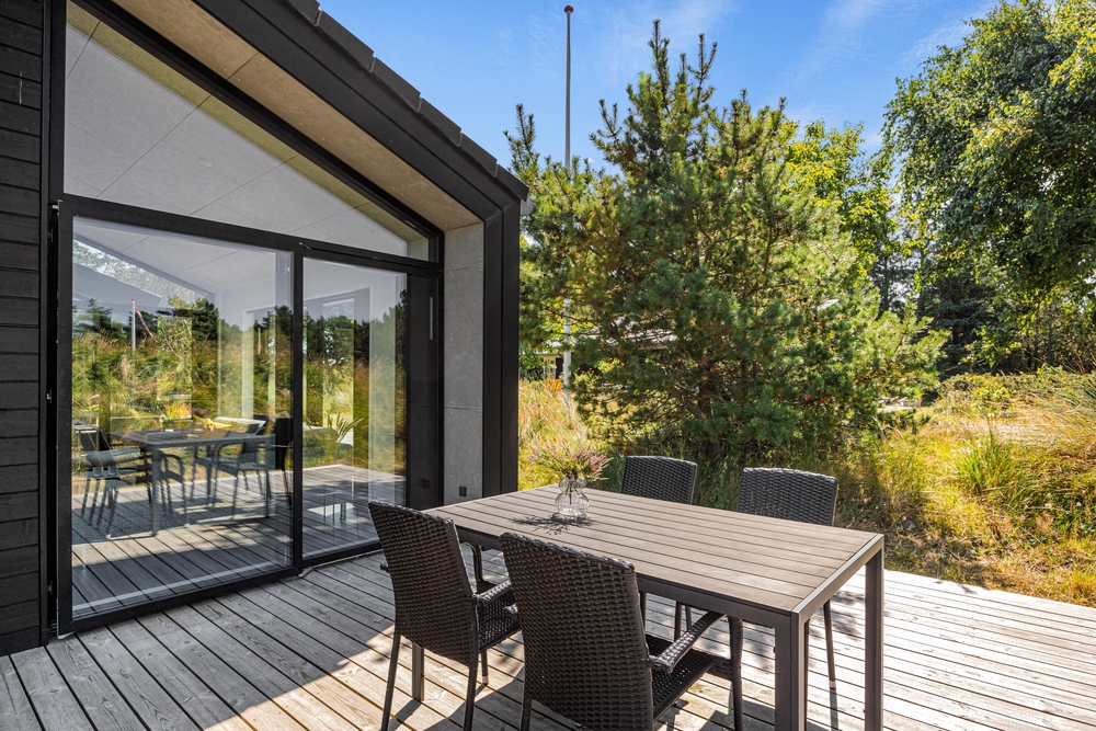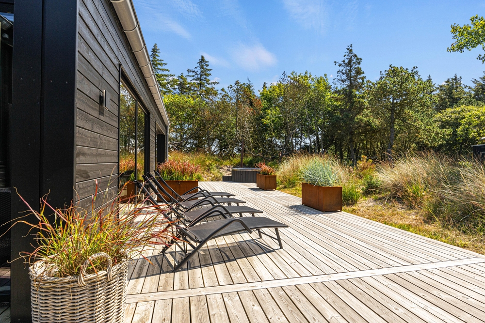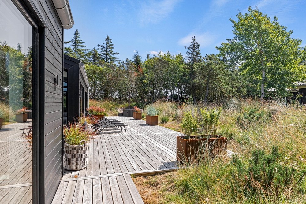 Euer geschmackvolles Ferienhaus liegt auf einem 1506 qm großen Naturgrundstück und ist gleich auf mehreren Seiten von einer schönen Holzterrasse umgeben. Hier findet ihr je nach Sonnenstand und Windrichtung immer einen schönen Platz zum Verweilen. Bei Regen könnt ihr euch unter den überdachten Teil zurückziehen und bei Sonne ein Sonnenbad auf den Liegen genießen.