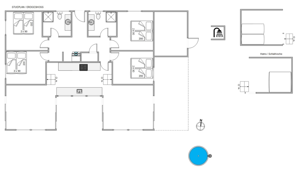 Besonders praktisch ist auch die Aufteilung des Ferienhauses, denn es gibt 2 moderne Bäder mit Fußbodenheizung, mit je 2 dazugehörigen Schlafzimmern. Somit ist es ideal für 2 Familien geeignet. Die 4 Schlafzimmer sind je mit 2 bequemen Einzelbetten ausgestattet, in denen ihr eure Batterien wieder aufladen könnt.