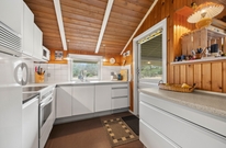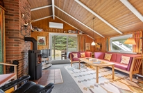 Der kombinierte Wohn-, Koch- und Essbereich bildet das Herzstück des Ferienhauses. Holzverkleidete Wände verleihen eine robuste Gemütlichkeit. Hier können alle entspannen und die gemeinsame Zeit miteinander genießen. Gerade am Morgen, wenn der Kamin noch nicht entfacht wurde, dient die energiesparende Wärmepumpe als kostengünstige Wärmequelle.