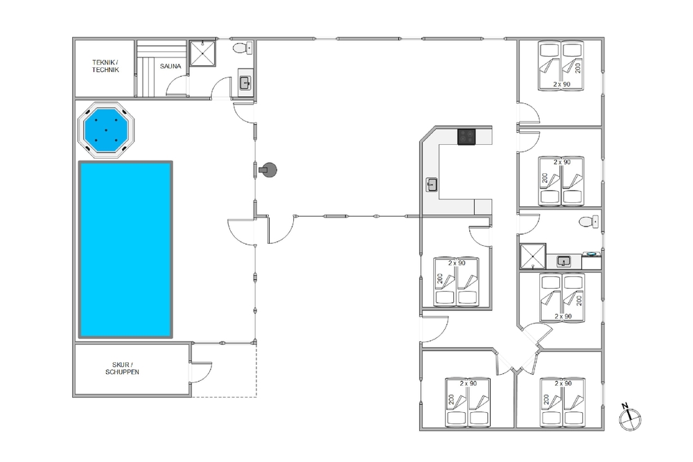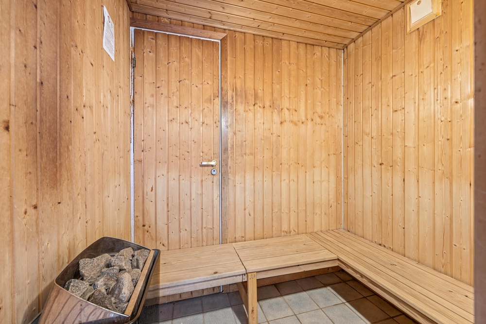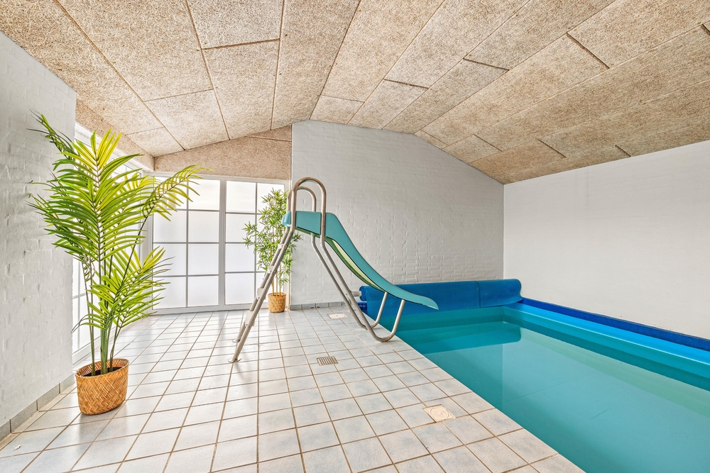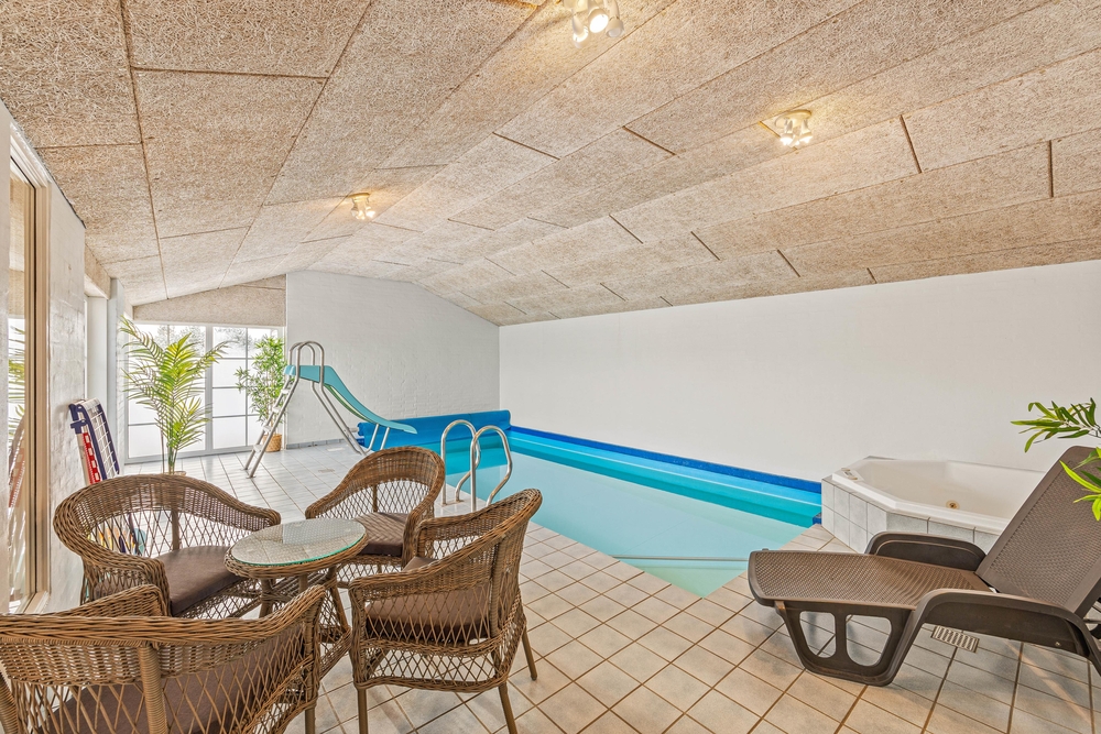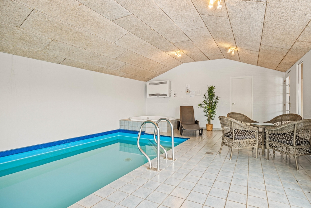 Einer der absoluten Höhepunkte des Ferienhauses ist der Poolraum, mit dem 18 qm großem Pool, Whirlpool und Sauna. Hier kann sich die ganze Familie vergnügen, egal ob ihr Spaß und Spiel oder Entspannung und Wohlbefinden sucht. Der Whirlpool mit Platz für 5 Personen wurde direkt im Poolraum integriert und im selben Bereich befindet sich die Sauna und ein Badezimmer mit Dusche. Das andere Badezimmer befindet sich direkt bei den Schlafzimmern. Natürlich sind beide Bäder mit einer Fußbodenheizung ausgestattet.