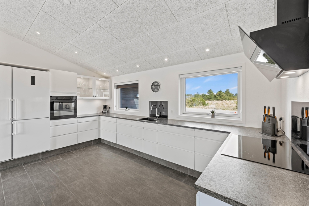 Der besondere Grundriss der 201 m² vom Ferienhaus im Solhaven 7, ist absolut durchdacht und ideal, wenn man mit 10 Personen anreist. Die Räume sind alle hell und offen gestaltet. Im Zentrum des Hauses ist die große Wohnküche, mit einem Traum von Küche. Hier werden das Kochen und das gemeinsame Essen zum Event. Von der einen Seite der Wohnküche, kommt ihr direkt in den großen Wohnbereich, mit bequemen Sofas und Sesseln und einem großen Flat Screen ? perfekt für einen gemütlichen Filmeabend bei dem Biokamin. Außerdem schließen an den Wohnbereich noch zwei Schlafzimmer, mit komfortablen Doppelbetten und das schöne Badezimmer mit integrierter Sauna und Duschnische an.