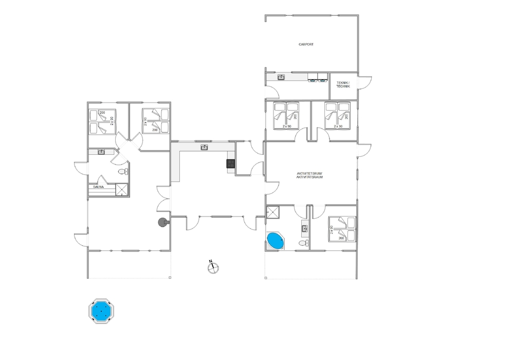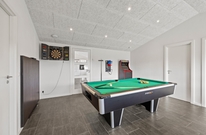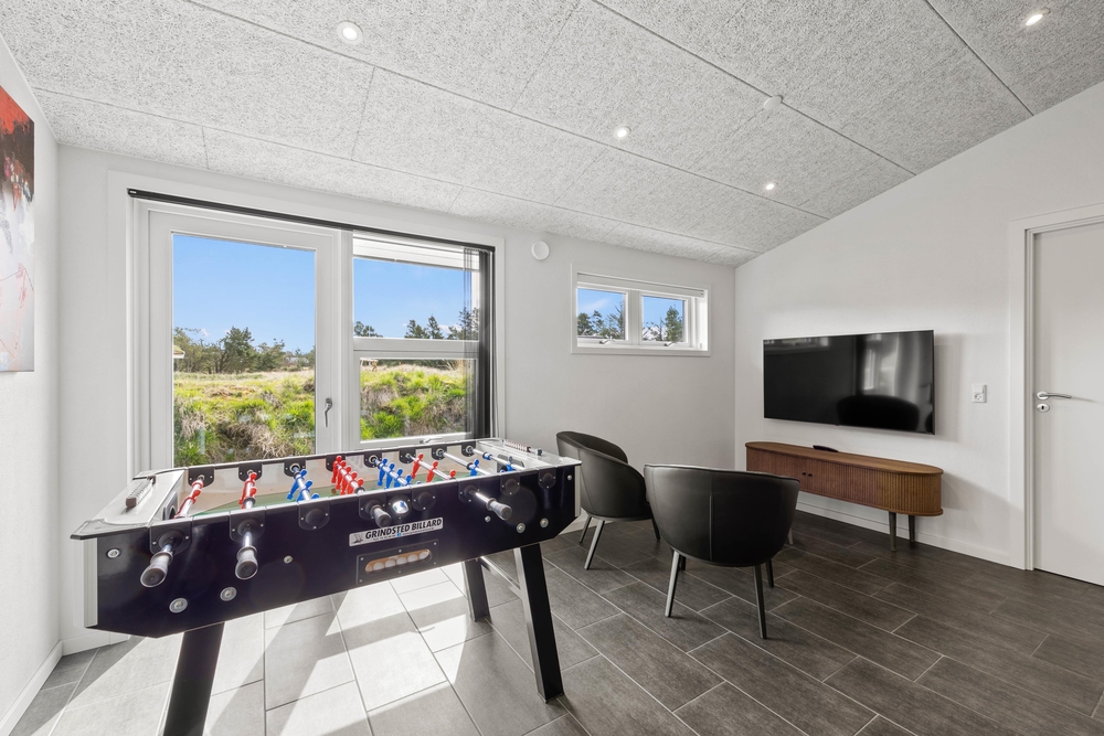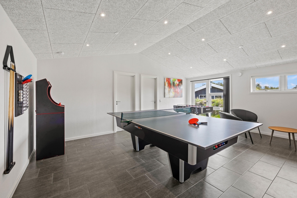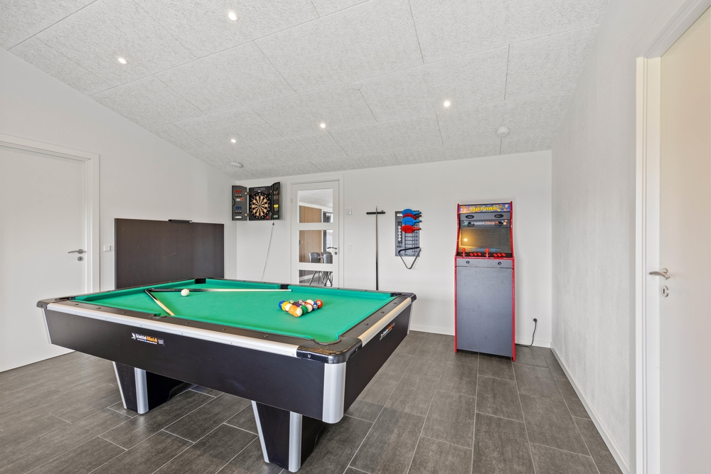 Auf der anderen Seite der Wohnküche ist der große Aktivitätsraum. Hier gibt es Spiel und Spaß für alle ? zum Beispiel bei einer Partie Billard, einer Runde Darts, am Spielautomaten oder bei einem kleinen Tischtennis Turnier. Vom Aktivitätsraum kommt man in drei weitere Schlafzimmer, die auch alle mit Doppelbetten ausgestattet sind. In drei der insgesamt fünf Schlafzimmer gibt es übrigens auch einen Flat Screen. Außerdem ist hier auch das zweite Badezimmer, mit einem schönen Whirlpool und Duschnische.