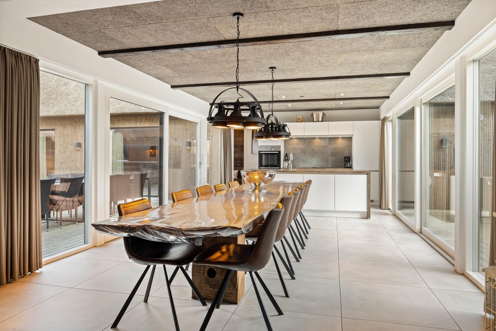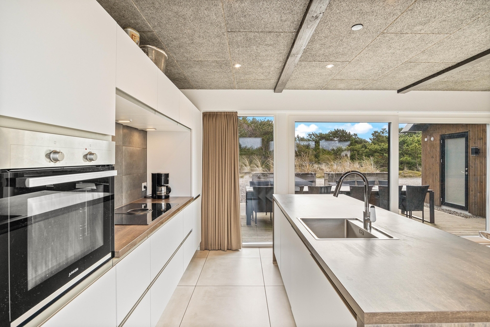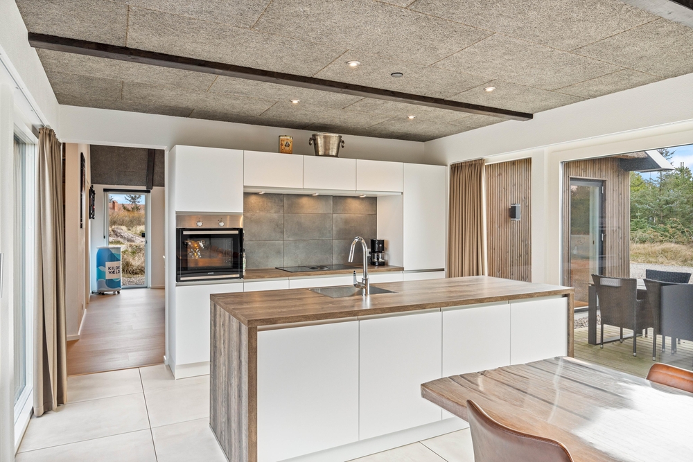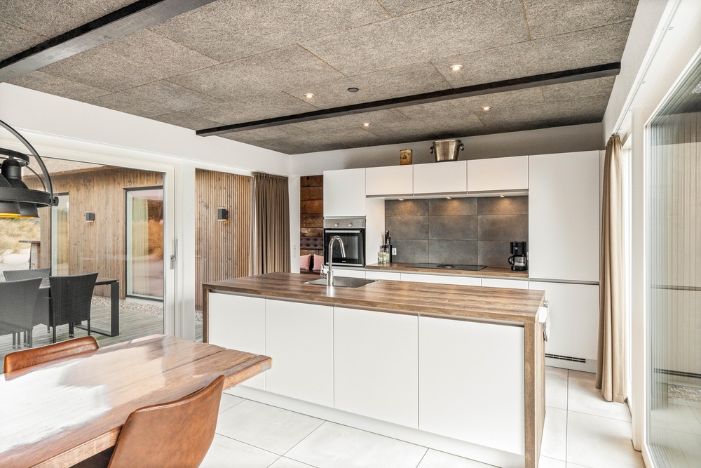 Auf der anderen Seite wurde die großzügige Küche mit Kochinsel und moderner Ausstattung untergebracht. Hier könnt ihr gemeinsam kochen und am großen Esstisch speisen. Probiert doch auch mal ein dänisches Rezept aus. Das gesamte Ferienhaus wird mit einer Wärmepumpe beheizt, die die Fußbodenheizung energiesparend betreibt.