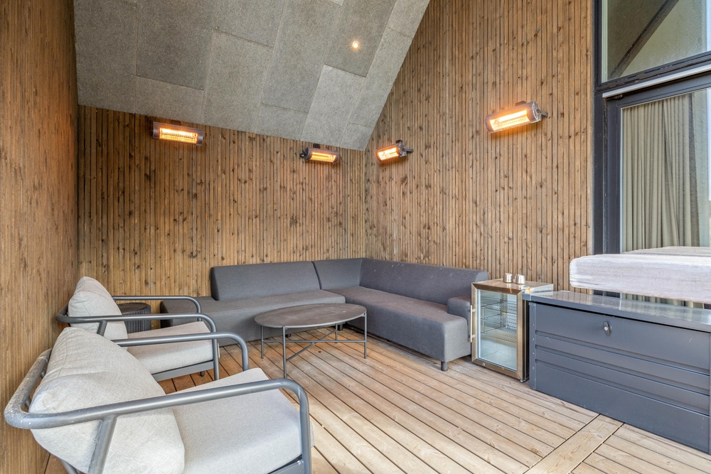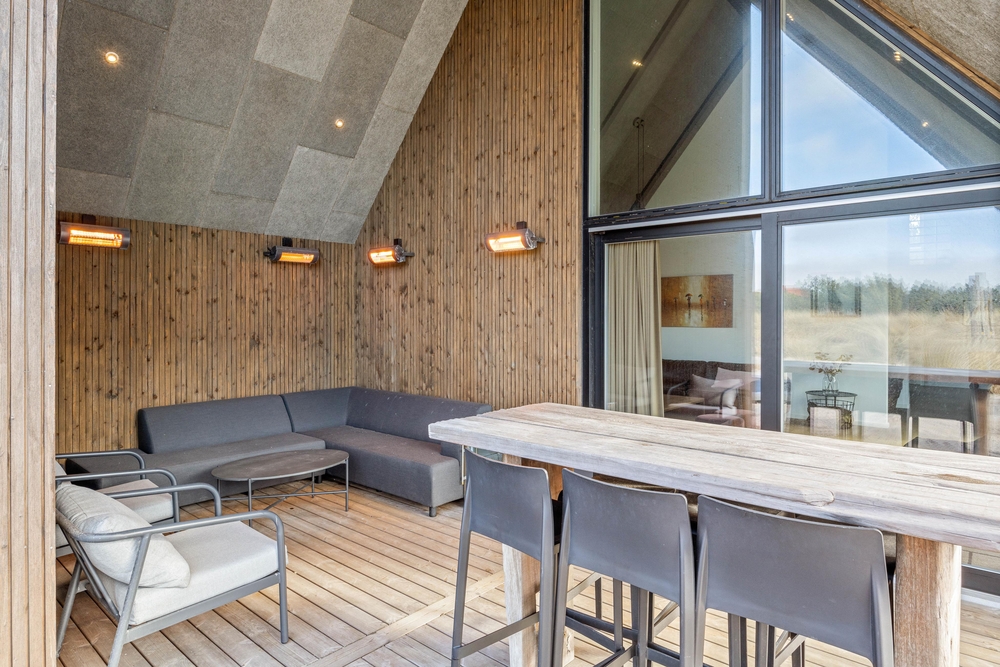 Auch auf dem schönen Naturgrundstück des Ferienhauses wird euch einiges geboten. Vom Wohnbereich aus gelangt ihr auf die großzügige, überdachte Terrasse, auf der ihr es euch auch bei Regen gemütlich machen könnt. Dank der Wärmestrahler habt ihr eine zusätzliche Wärmequelle.
