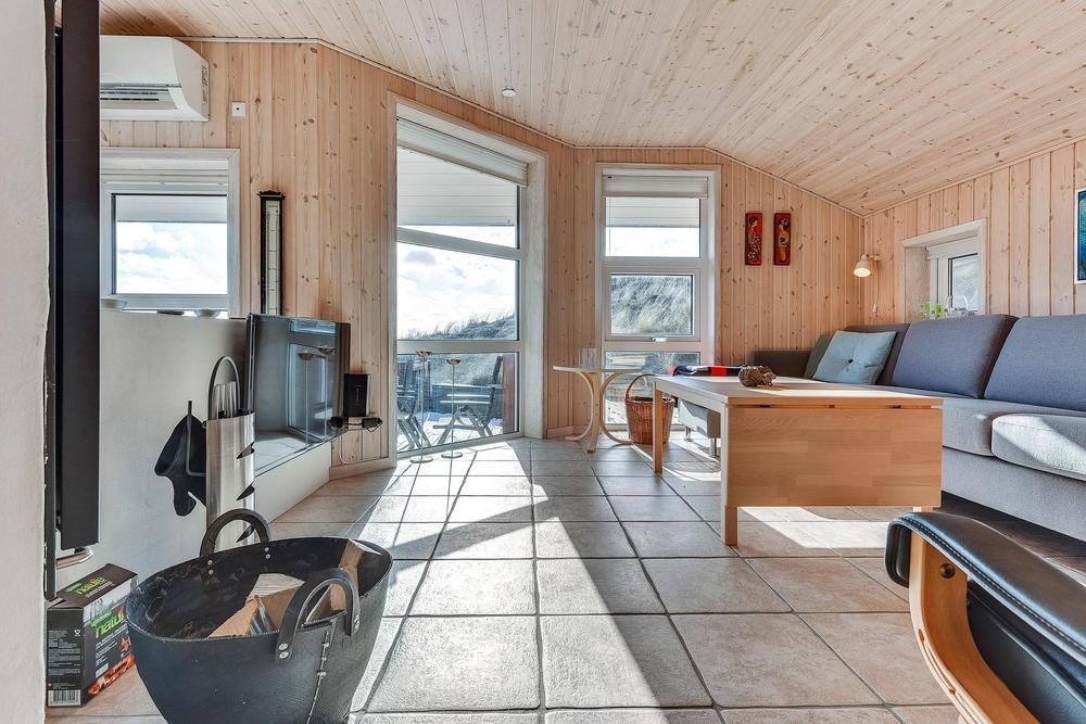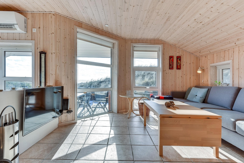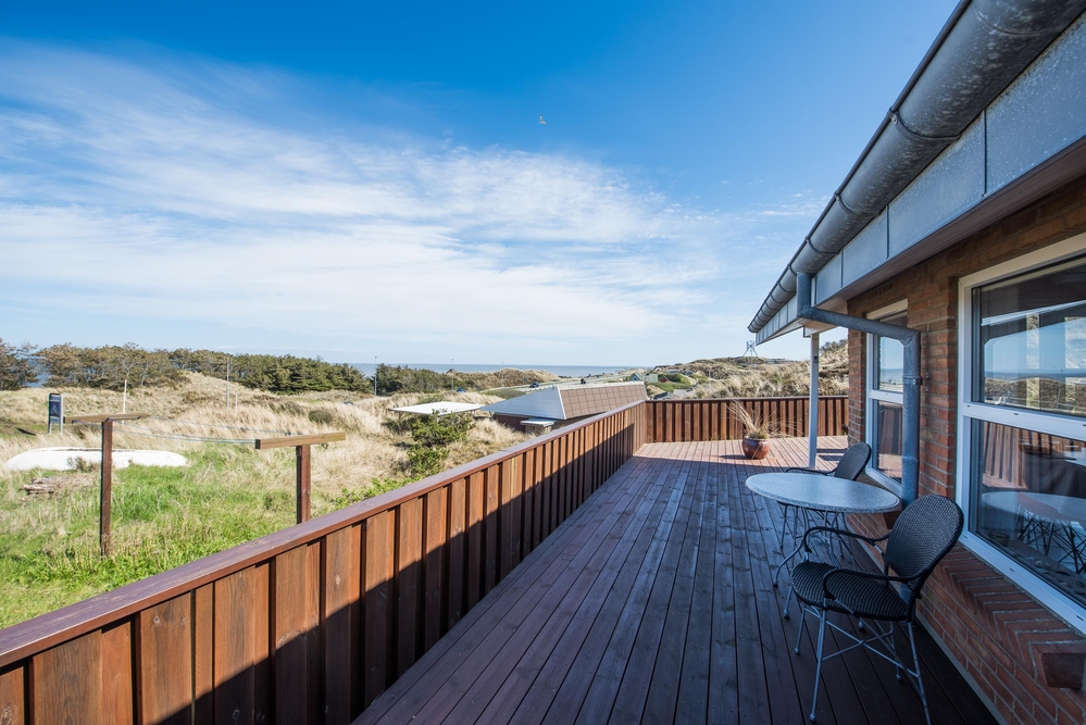 Vom Wohnraum aus habt Ihr Zugang auf die grosse abgeschirmte Sonnenterrasse, die mit guten und bequemen Gartenmöbeln ausgestattet ist. Auch von hier aus habt Ihr eine wunderschöne Aussicht auf den Fjord und die umliegende Dünenlandschaft. An warmen Sommertagen könnt Ihr hier gemütliche und unvergessliche Grillabende miteinander verbringen.