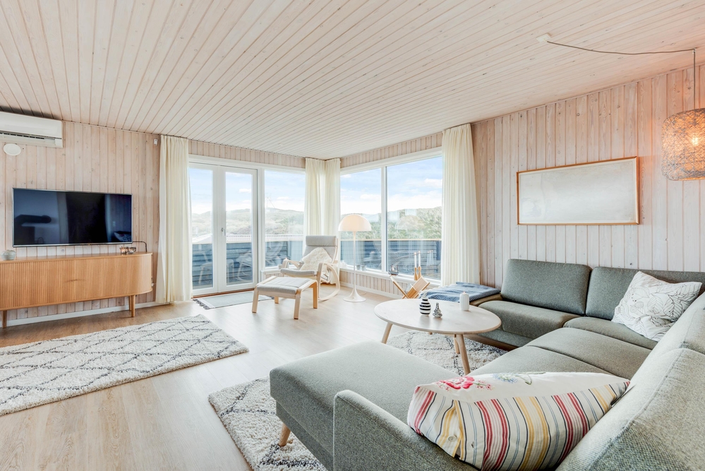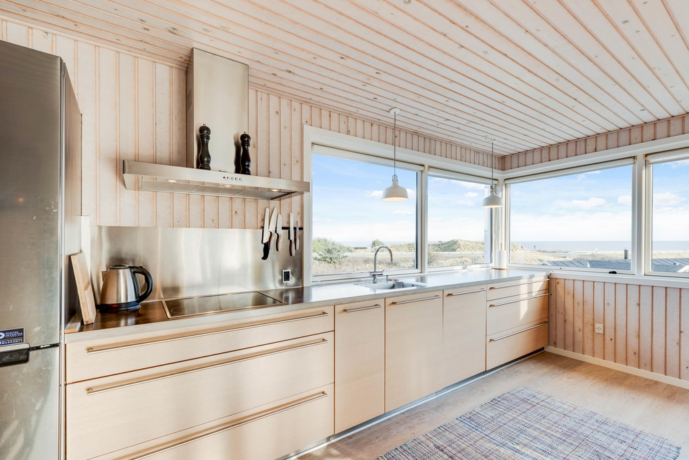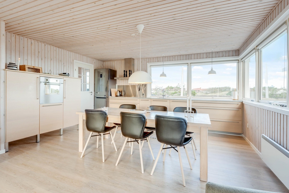 Der lichtdurchflutete Wohnraum mit der integrierten offenen Küche lädt zu vielen schönen Ferienstunden ein. Beim Zubereiten leckerer Ferienmahlzeiten in der gut ausgestatteten Küche, habt Ihr Aussicht auf den Ringköbing Fjord. An kühleren Tagen verbreitet der knisternde Kaminofen eine wohlige Wärme, während draussen der rauhe Westwind die Dünengräser zerzaust.