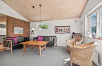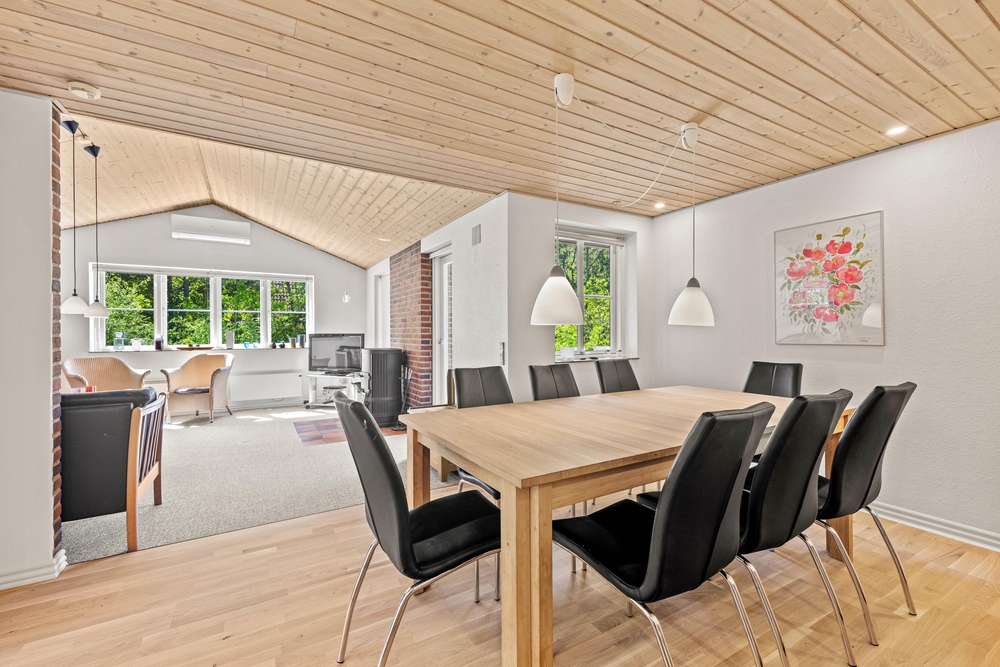Das Wohnzimmer ist praktischerweise mit dem Essbereich sowie der offenen Küche kombiniert, sodass ihr hier wunderbar gemeinsam neue Rezepte ausprobieren, lecker Essen oder auch ganz entspannt die Beine hochlegen, und die angenehme Wärme des Kaminofens spüren könnt. Alternativ zum Kamin ist das Ferienhaus in Houstrup auch mit einer modernen Wärmepumpe versehen, welche energiesparend für angenehme Temperaturen sorgt.