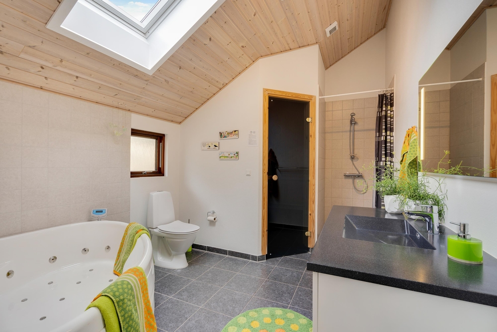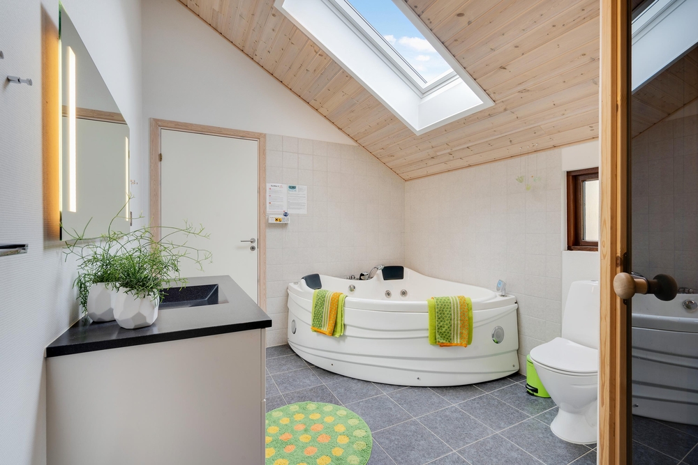 Für warme Füsse sorgt die Fussbodenheizung in den 2 Baderäumen, wobei das Eine mit einer Sauna und einem Whirlpool ausgestattet ist und in dem Anderen steht eine Waschmaschine und ein Trockner.
