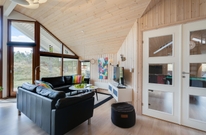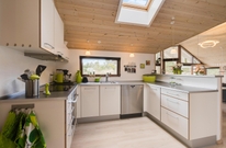 Dadurch, daß der große Ess-und Wohnbereich mit der Küche integriert ist, können alle auch beim Essenzubereiten zusammen sein. Durch die grosse Fensterparti könnt ihr von hier aus die schöne Natur im Aussenbereich geniessen, vielleicht kommt ein Reh vorbei.