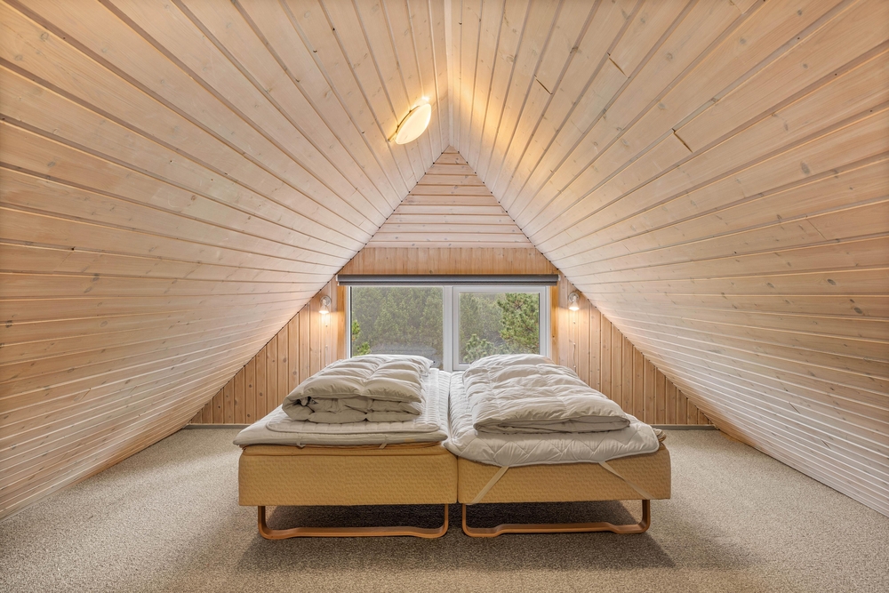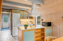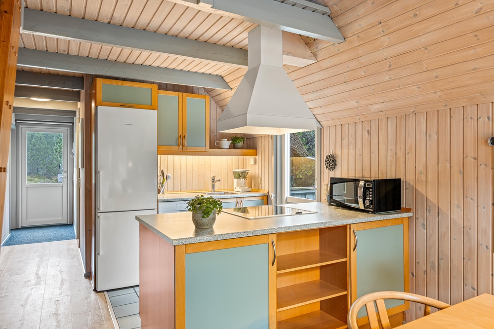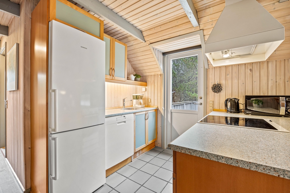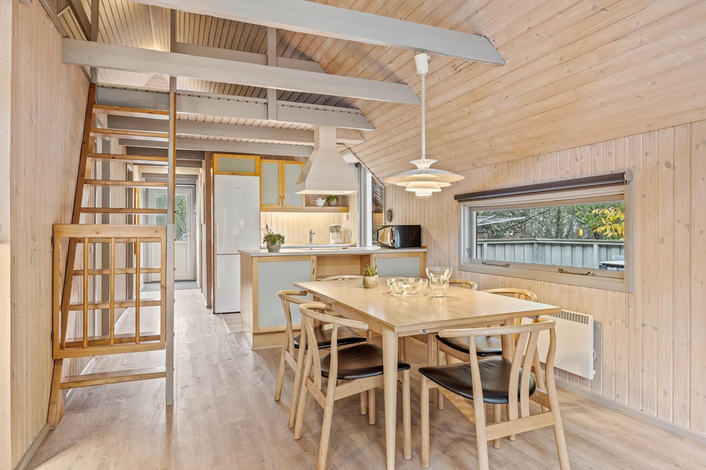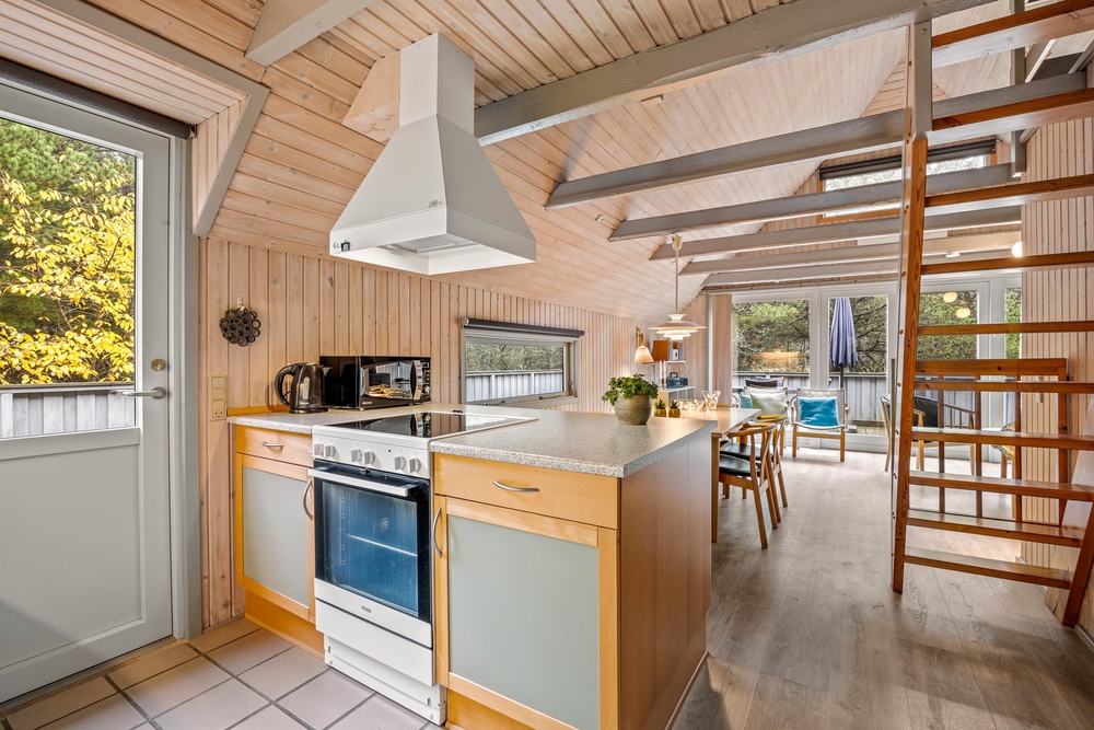 Das Ferienhaus hat einen Wohnbereich mit integrierter Küche. Die Küche ist gut ausgestattet unter anderem mit einer Spülmaschine. Von hier aus kommt ins Dachgeschoss, wo sich zwei Schlafgelegenheiten und ein Aufenthaltsbereich für Kinder befindet, in dem sie sich zurückziehen können.