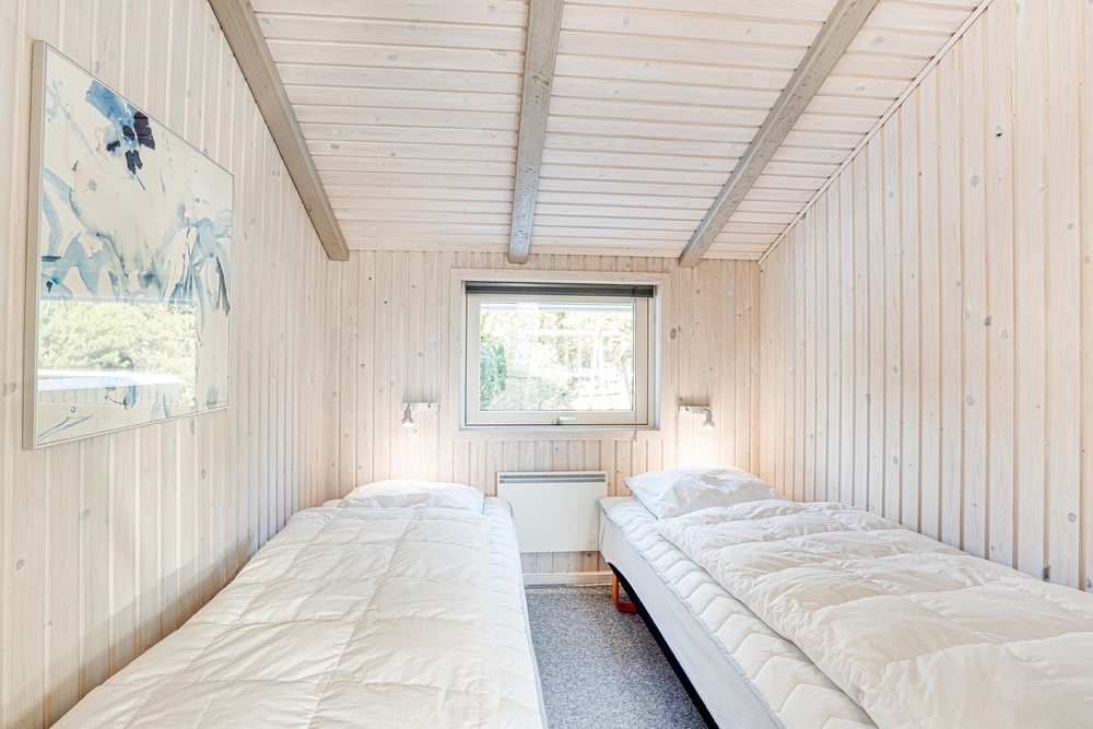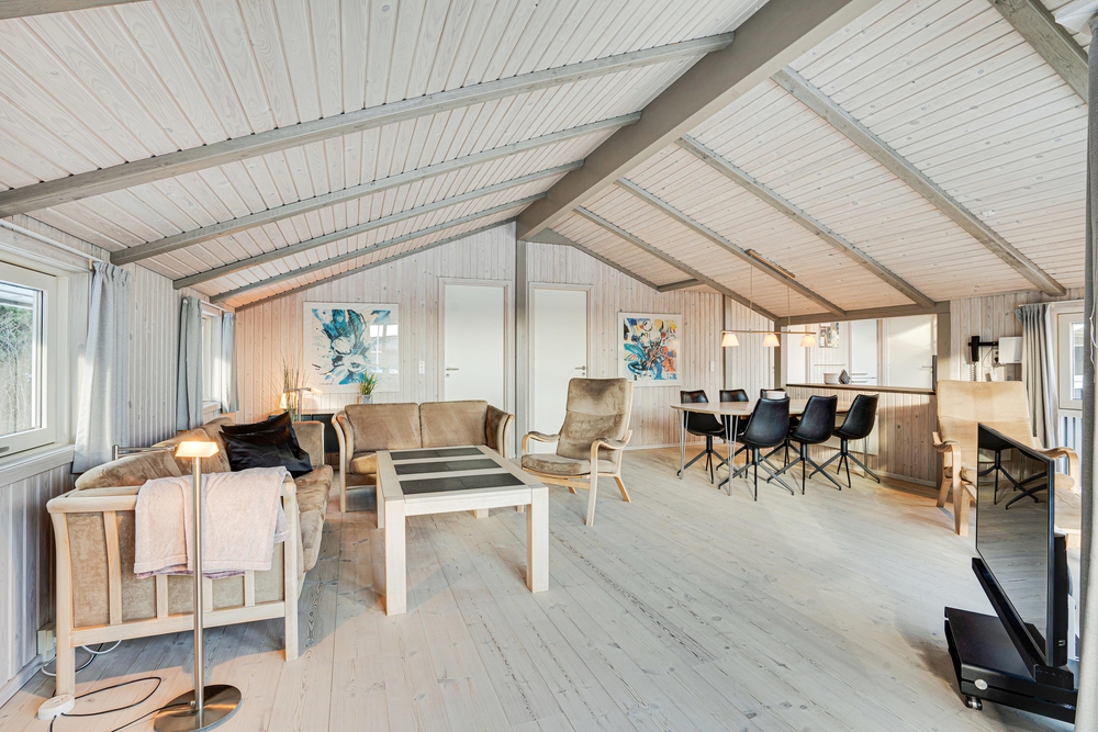 Sollte das Wetter sich mal nicht von seiner besten Seite zeigen, lädt der Wohnbereich mit hellen Möbeln zu kuscheligen Stunden vor dem Kamin ein. Hier macht ihr es euch mit einem Buch, einem Tee oder einem Glas Wein gemütlich. Das Haus ist mit einer energiesparenden Wärmepumpe ausgestattet, welche auch an kalten Tagen für ein angenehmes Raumklima sorgt.