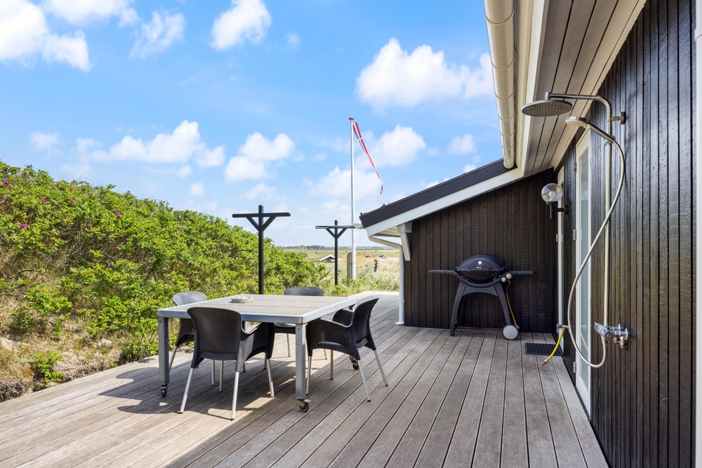 Nicht nur drinnen könnt ihr die atemberaubende Aussicht genießen. Das Ferienhaus hat 2 gemütliche Terrassenbereiche. Eine Terrasse ist nach Osten und Süden ausgerichtet, die zweite, kleinere Terrasse ist nach Westen ausgerichtet und ideal für die Abendstunden. Auf den Terrassen könnt ihr es euch auf den Gartenmöbeln oder in der einladenden Hängematte bequem machen. Um einen spannenden Tag ausklingen zu lassen, könnt ihr den Grill anwerfen und das Abendmenü im Freien zubereiten. Eines der Highlights des Außenbereichs ist der Carport, wo euer Auto vor dem Wind geschützt ist. Unter der Außendusche könnt ihr von April-November euch erfrischen oder einfach den Sand von den Füßen spülen.
