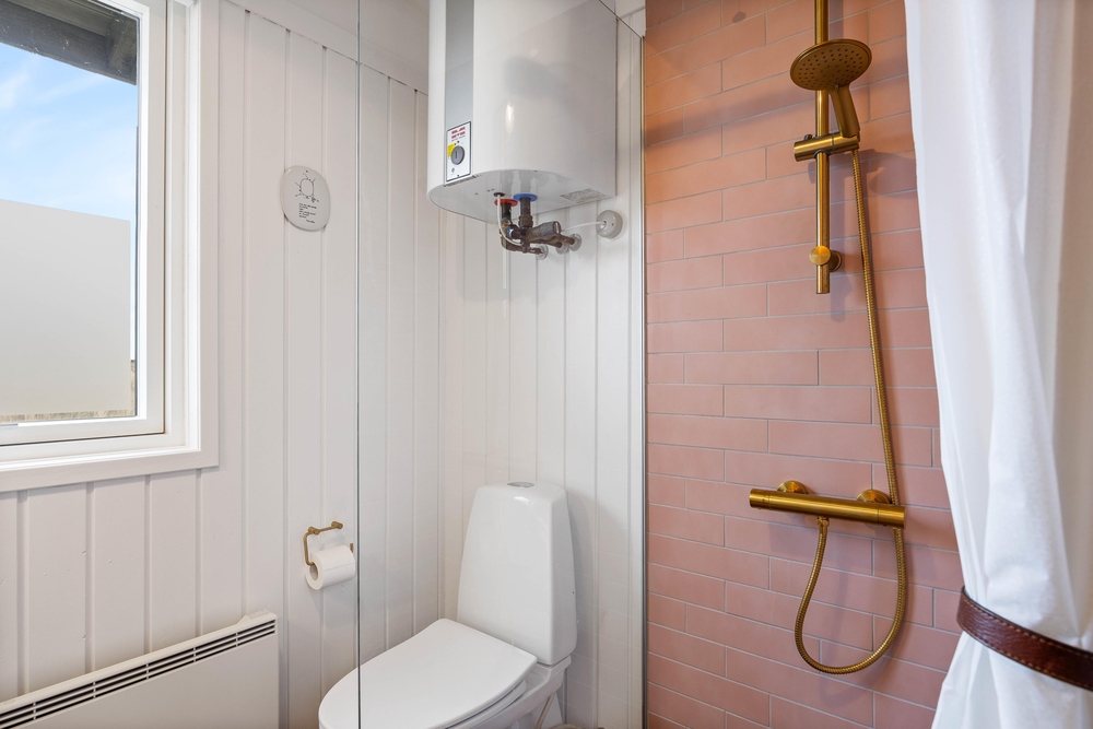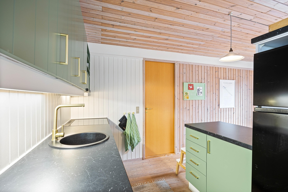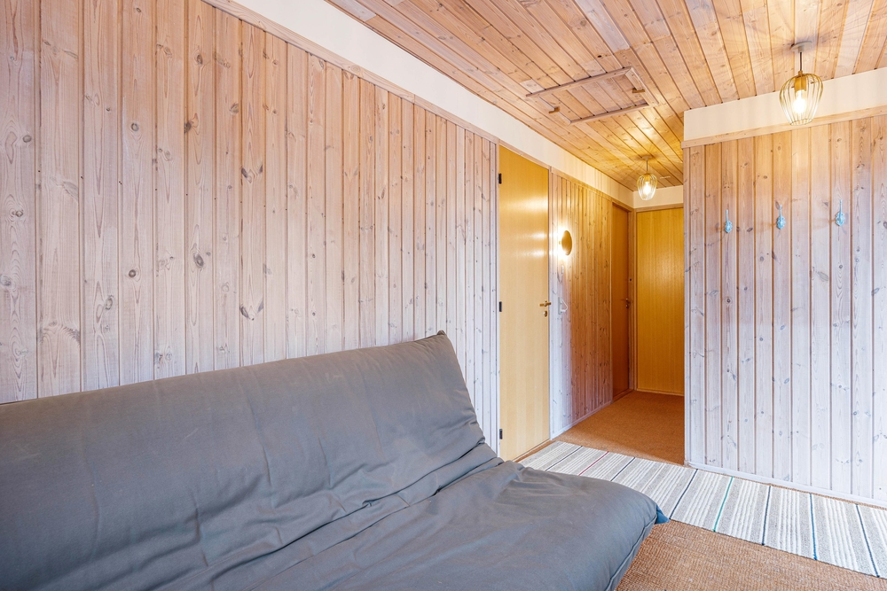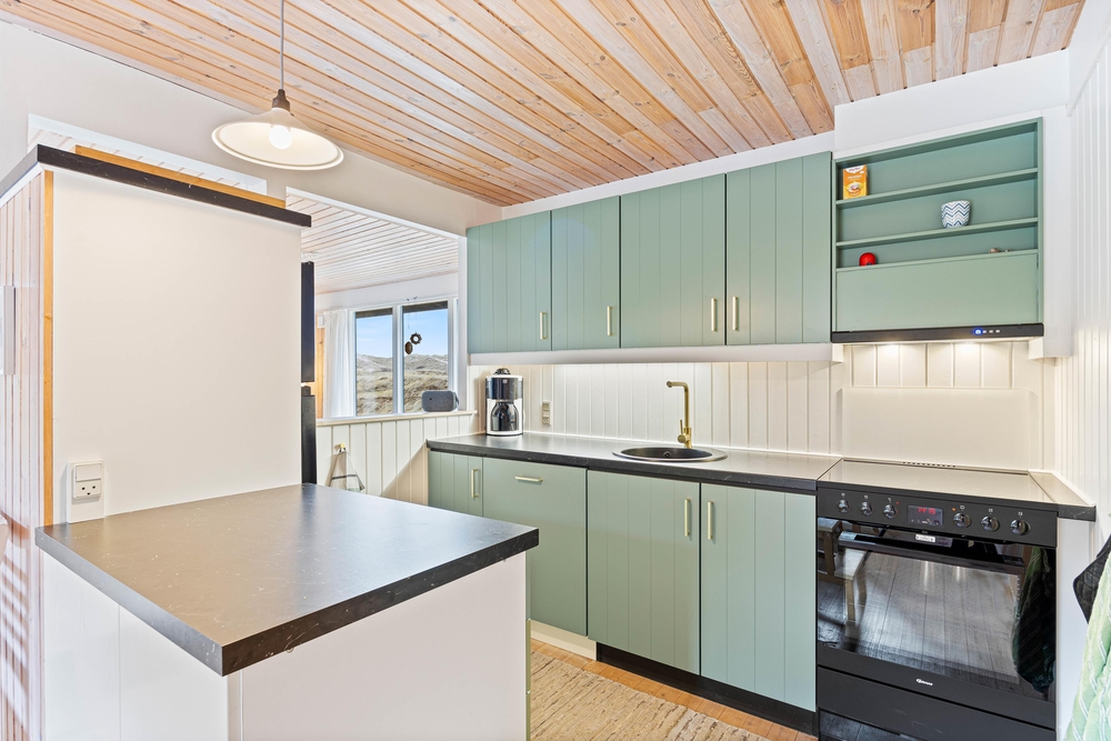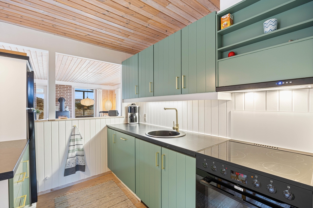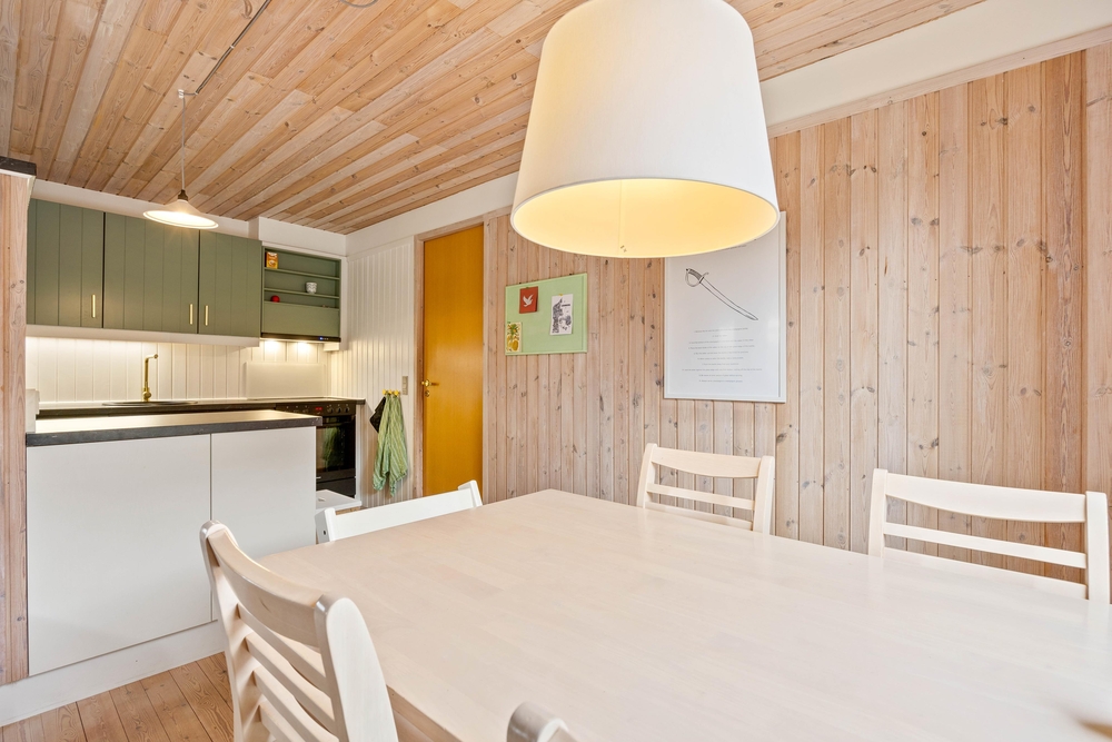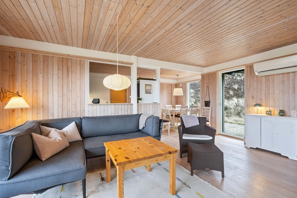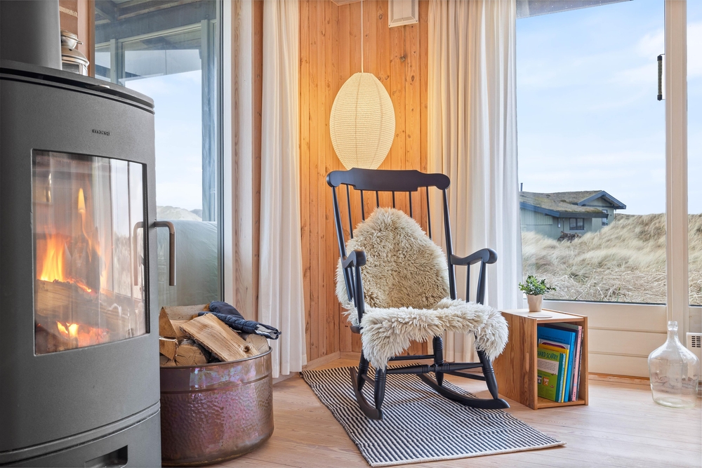 Wenn ihr das Ferienhaus betretet, werdet ihr mit einer typischen Ferienhausatmosphäre begrüßt, die durch die holzvertäfelten Wände unterstrichen wird. Der Wohnbereich der Küche, Essbereich und Wohnzimmer miteinander verbindet, bildet den Mittelpunkt des Ferienhauses. Hier könnt ihr gemeinsam kochen, einen Spieleabend verbringen, die nächsten Aktivitäten in eurem Urlaub planen oder es euch auf dem Sofa für einen Filmabend gemütlich machen. An regnerischen und kalten Tagen sorgt der Holzofen im Wohnbereich für eine wohlige Wärme und eine Extraportion Gemütlichkeit. Neben dem Holzofen wurde auch eine energiesparende Luft-zu-Luft Wärmepumpe im Ferienhaus installiert, die für eine angenehme Wärme sorgt.